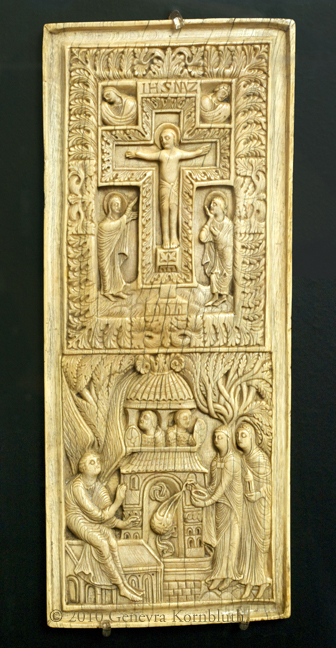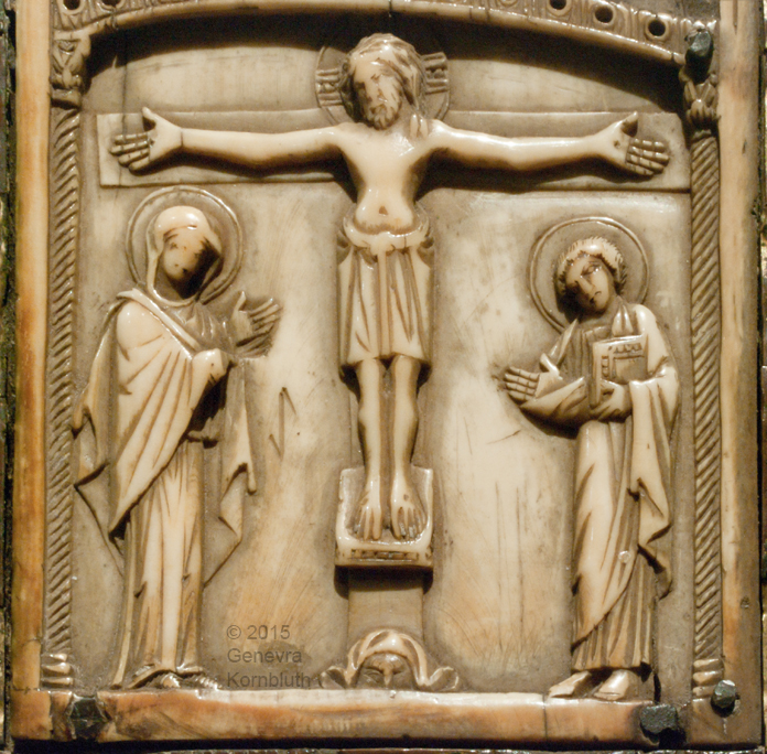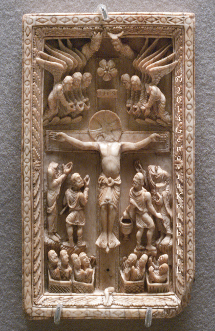 Crucifixion ivory, 10th c. Byzantine, on Small Bernward Gospels cover, Hildesheim 12th c., HildMus DS13. For other views see HildMus.