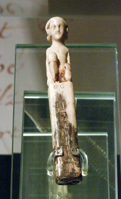 knife handle with dice player, ivory, c.1300, MAHSD