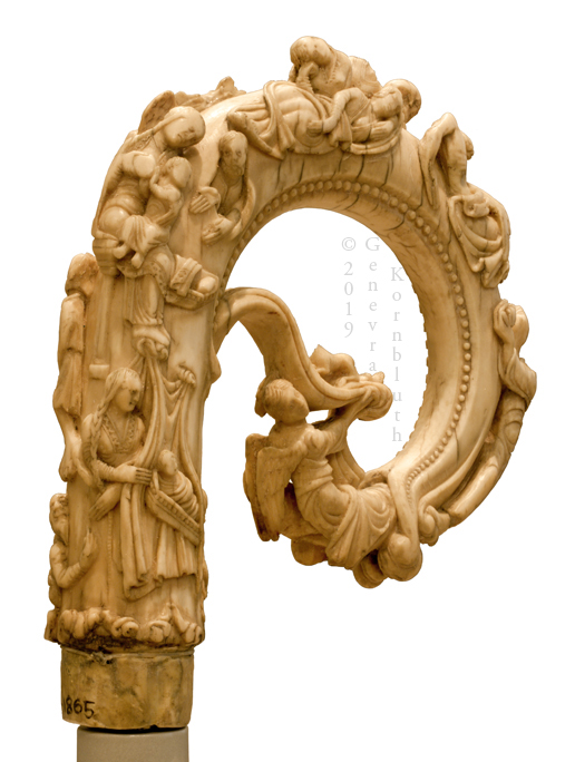 ivory crozier head, St. Nicholas birth, refusal to nurse; c.1150-70, V&A 218-1865. For other views see V&A.