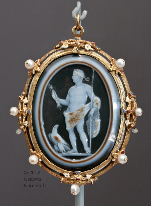 frame, Italy, late 16th c.: gold, pearls, enamel; for agate cameo Emperor Claudius as Jupiter, agate cameo 41-54 CE. AIC 1991.375