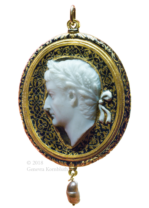 frame, profile, Italy, late 16th c.: gold, pearls, enamel; for agate cameo Emperor Claudius as Jupiter, agate cameo 41-54 CE. AIC 1991.375