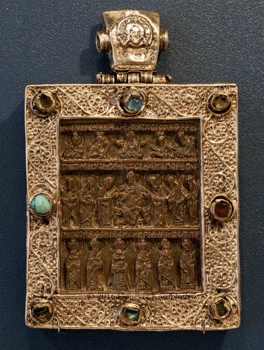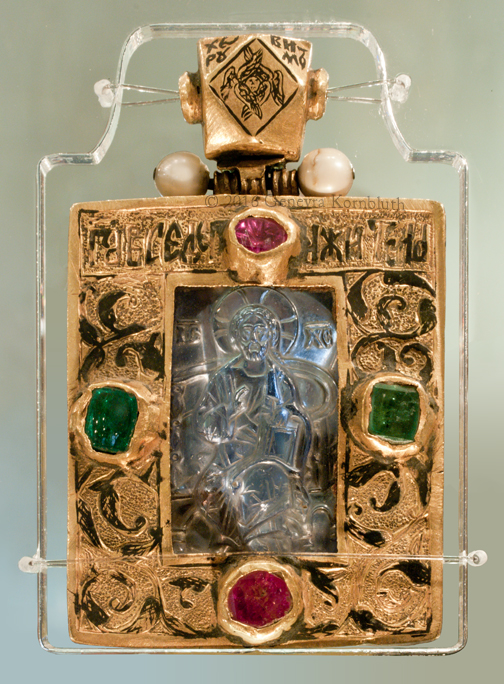 Christ enthroned, sapphire cameo/gold/ruby/emerald/pearl/enamel, Novgorod 16th c., Novgorod AM 3269-78.PEF