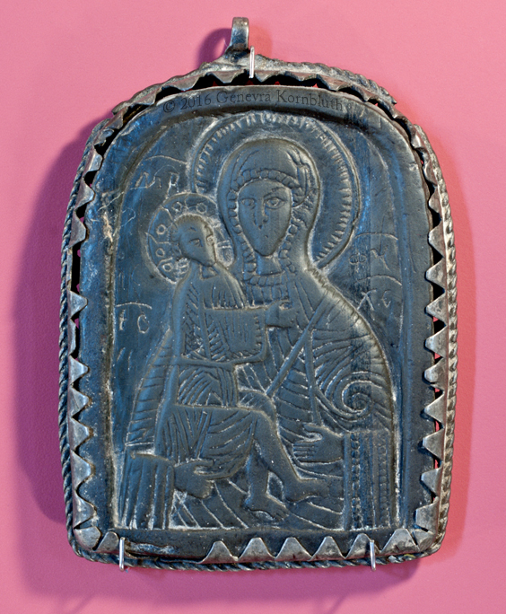 Virgin and Child, stone (shale/schist?)/silver, 14th c., Novgorod AM