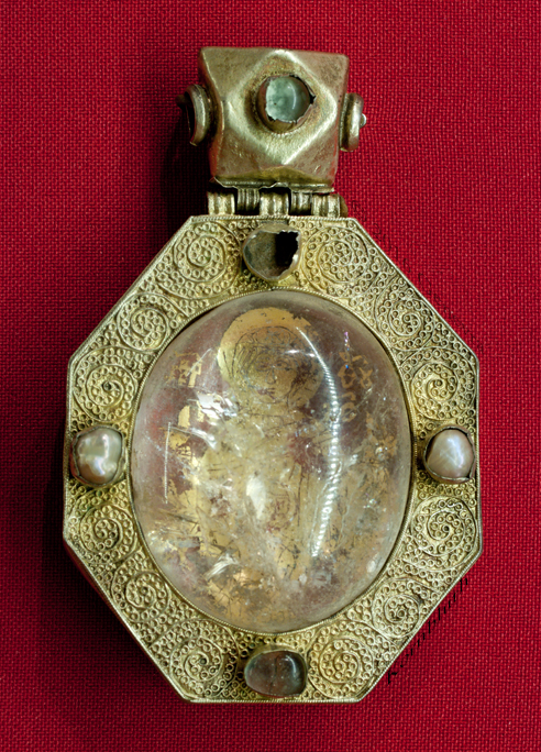 Our Lady of the Sign pendant, silver/rock crystal/pearl/glass/wood, 16th c. Novgorod, Novgorod AM