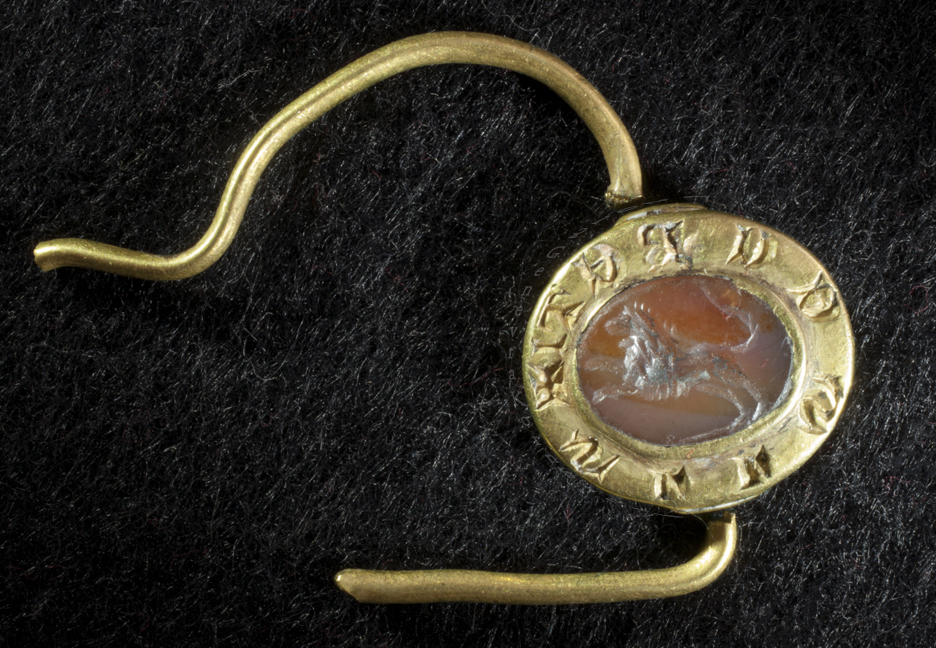 13th c. gold seal ring with 2nd-3rd c. carnelian intaglio, HNM K.60.3.B, which has its own page