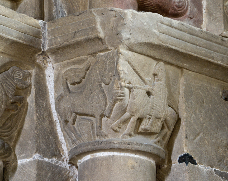 engaged capital with 2 martyrs and (?)allegory, limestone, c.1125, MAHSD. For contiguous faces see the Saint-Denis museum page.