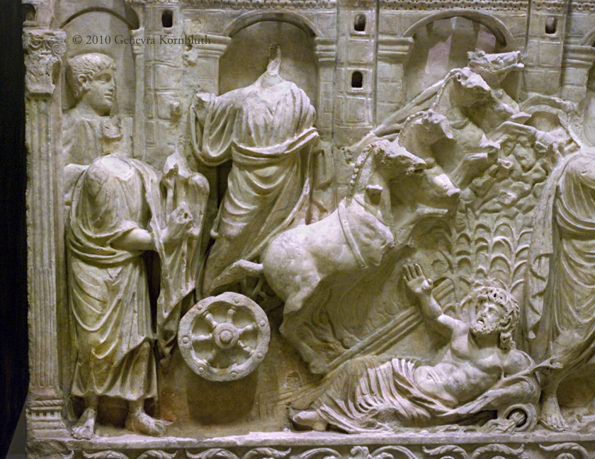 Ascent of Elijah, sarcophagus from under St Peter's, Rome, marble, c.390-400, Louvre MR 688, 753, 806. This work has its own page.