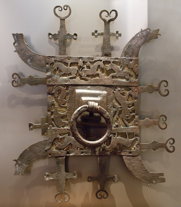 door fitting fr. Flæte stave church, Arnafjord, wrought iron/copper, 13th c.?: dragon heads, unicorns, pig, lion, horses, bird; Bergen MA 281a or b