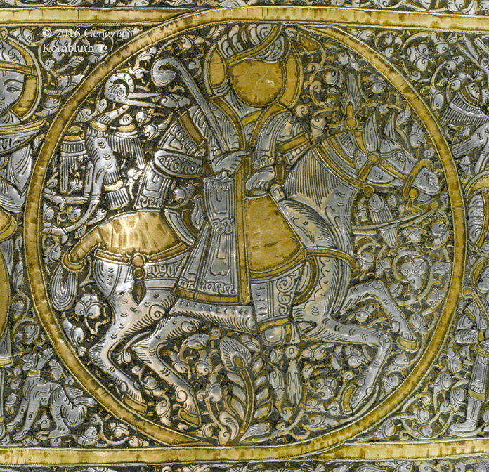 St. George and the dragon, marble, Michel Colombe 1509-10; frame prob. Jerome Pacherot, Jean Chersalle, Bertrand de Meynal. Louvre MR 1645. This work has its own page.