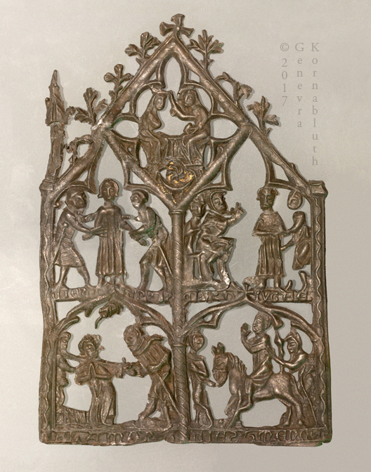 Thomas, Earl of Lancaster: panel with capture, trial, *journey, and execution; above: Coronation of the Virgin; mid/late 14th c., lead alloy partly gilt, from River Thames bank, MoL