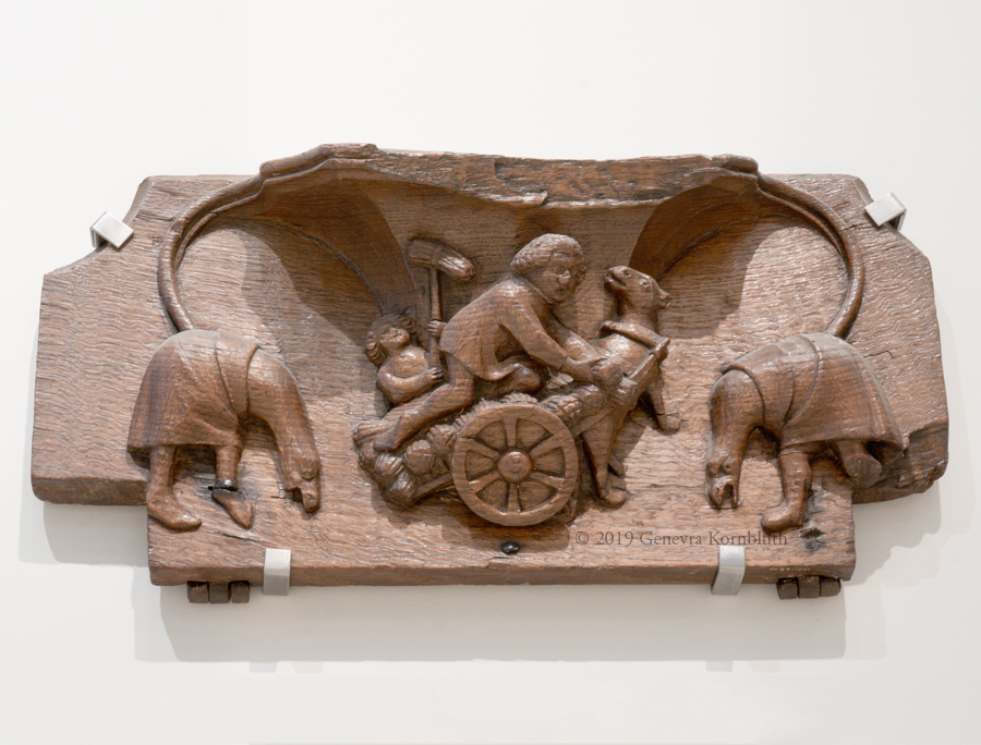 oak misericord: loading grain on cart, England late 14th c., V&A W.53-1921