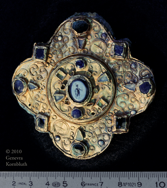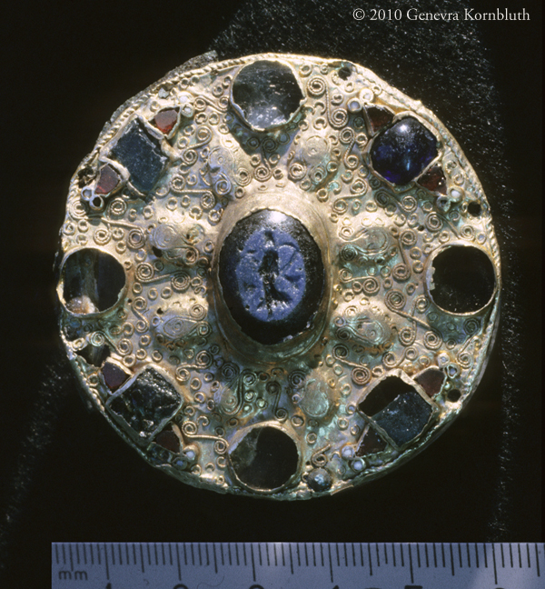 disk fibula from Bad Hönningen, gold with Roman intaglio and bronze back plate, 630/40-80, RLM 35.54