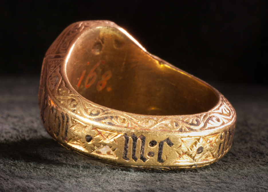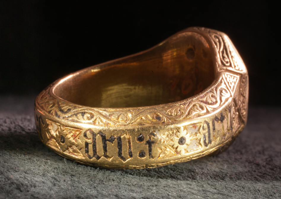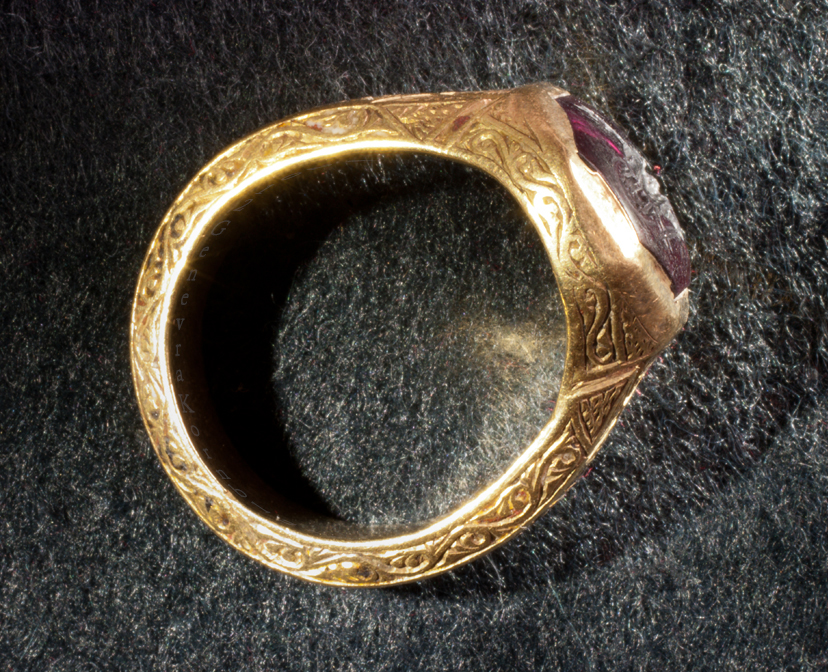 Historical Archive: John the Baptist Ring garnet intaglio in gold ring with niello and enamel stone 1.47 x 1.1 cm, ring 2.85 x 2.43 cm (.58 x .43, 1.12 x .96 inches) Italy, fourteenth century Latin inscription: Verbum caro factu(m est), The word was made flesh Vienna, Kunsthistorisches Museum XII 168