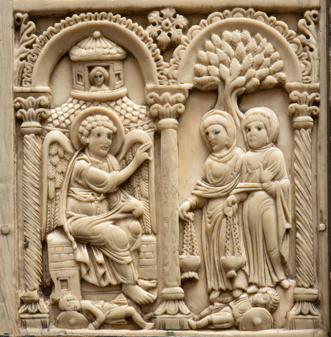 Historical Archive: Harrach diptych back probably Spain or northern Italy, 7th-8th century front "Court School of Charlemagne", Aachen, early ninth century ivory with glass eyes, full object 33.7 x 23 cm (13.3 x 9 inches) wooden frame postmedieval, left and right panels switched formerly in the collection of Count Harrach, Hrádek Castle, Bohemia loan from the Ludwig collection, Aachen Cologne, Schnütgen Museum 1012