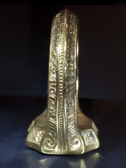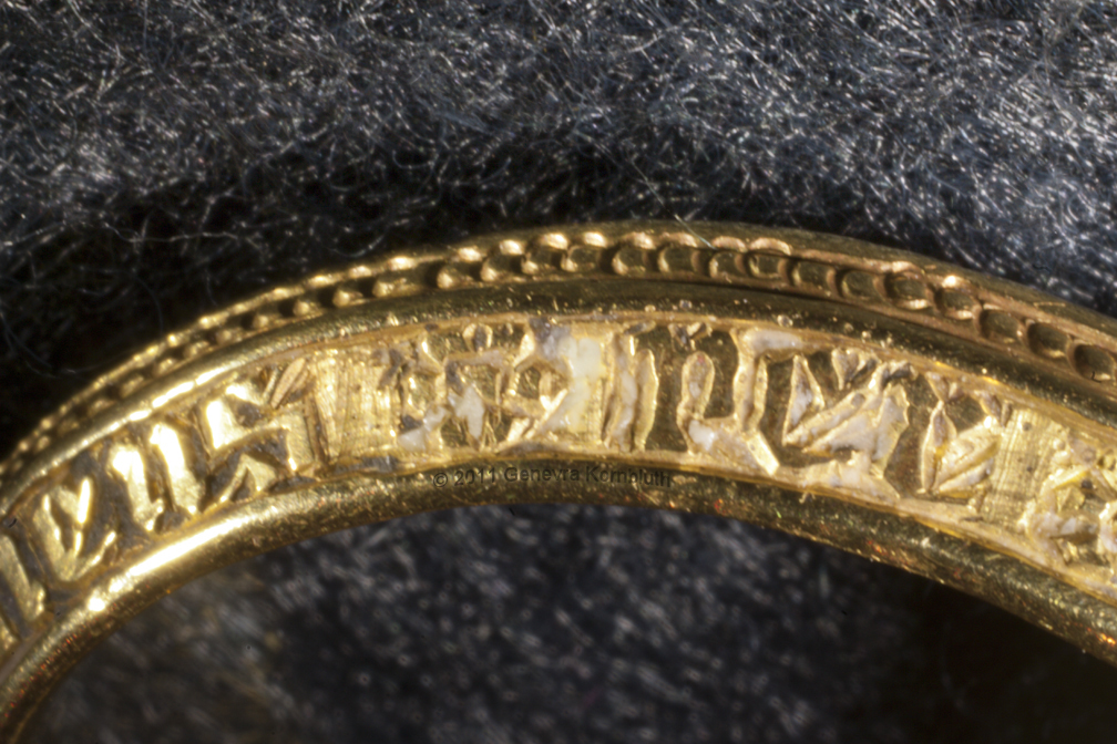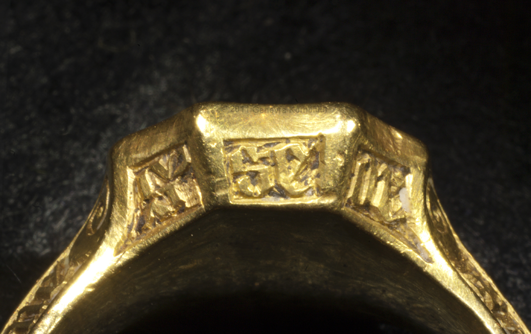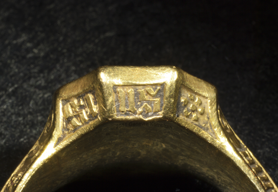 Signet ring "of the Black Prince" possibly owned by Prince Edward of Woodstock, 1330-1376 ruby or garnet intaglio, gold, and traces of enamel ring diameters 2.3 and 2.7 cm (0.9 x 1.1 inch) second half of fourteenth century bezel inscription: SIGILLUM SECRETUM, "secret seal" inscription on edge of bezel: S/ GE/OR/GI/US, "Saint George" inscription on sides of band: +IEXUS AVTEM * TRANSIENS * PER * ME DIVM ILLORVM * IBAT * ET * VERBUM * C "But he passing through the midst of them. And the Word" (Luke 4, John 1) Paris, Musée du Louvre OA 9597 |