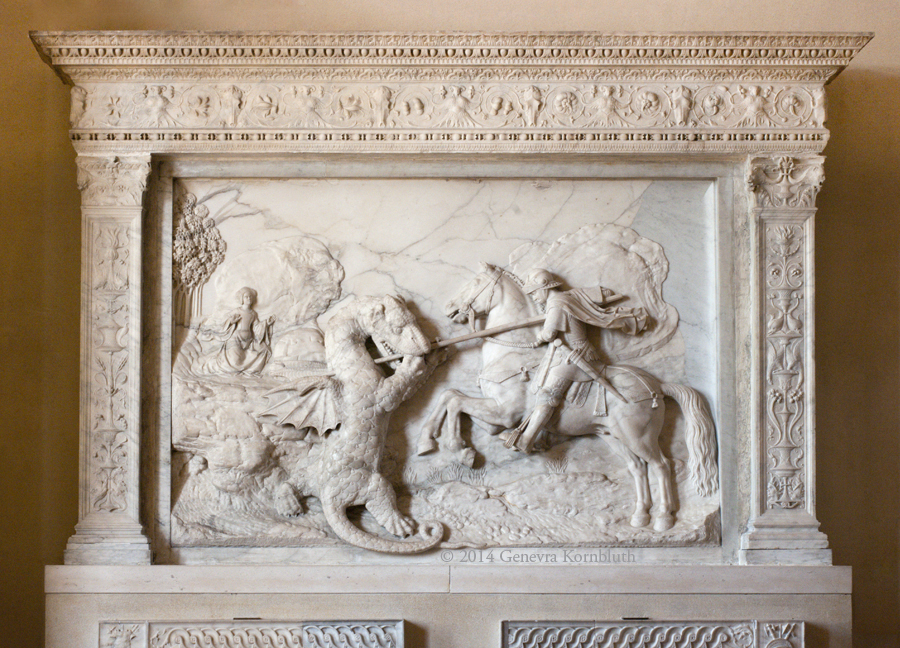 St. George and the dragon, marble, Michel Colombe 1509-10; frame prob. Jerome Pacherot, Jean Chersalle, Bertrand de Meynal. Louvre MR 1645. This work has its own page.