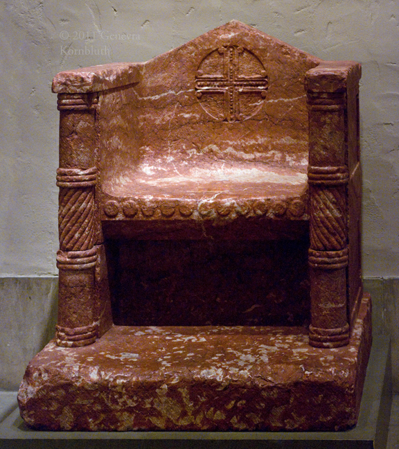 bishop's throne (cathedra), marble, 1150-1200 Rousillon with 20th c. cross on back, PMA 1929-109-1. For another view see PMA.
