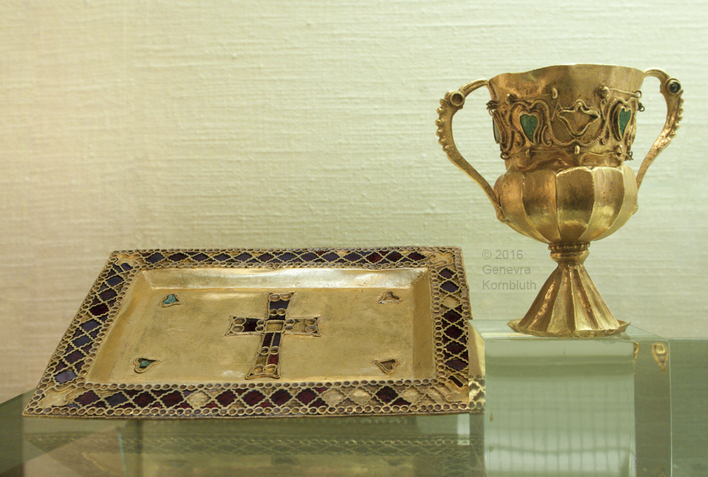 Gourdon Chalice and Paten. Gold, turquoise, red glass, and garnet, c.500, CdM. These works have their own page.