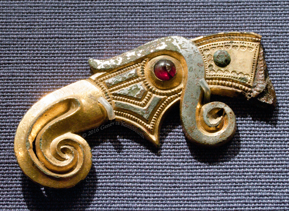 bird of prey head fr. Åker, shield plaque, bronze/gilt/garnet/white metal/iron, c.600? OHM C4903