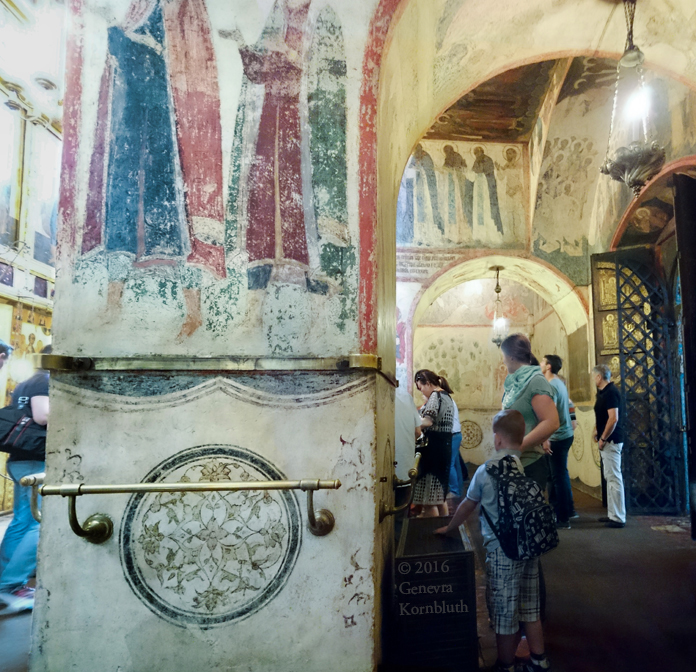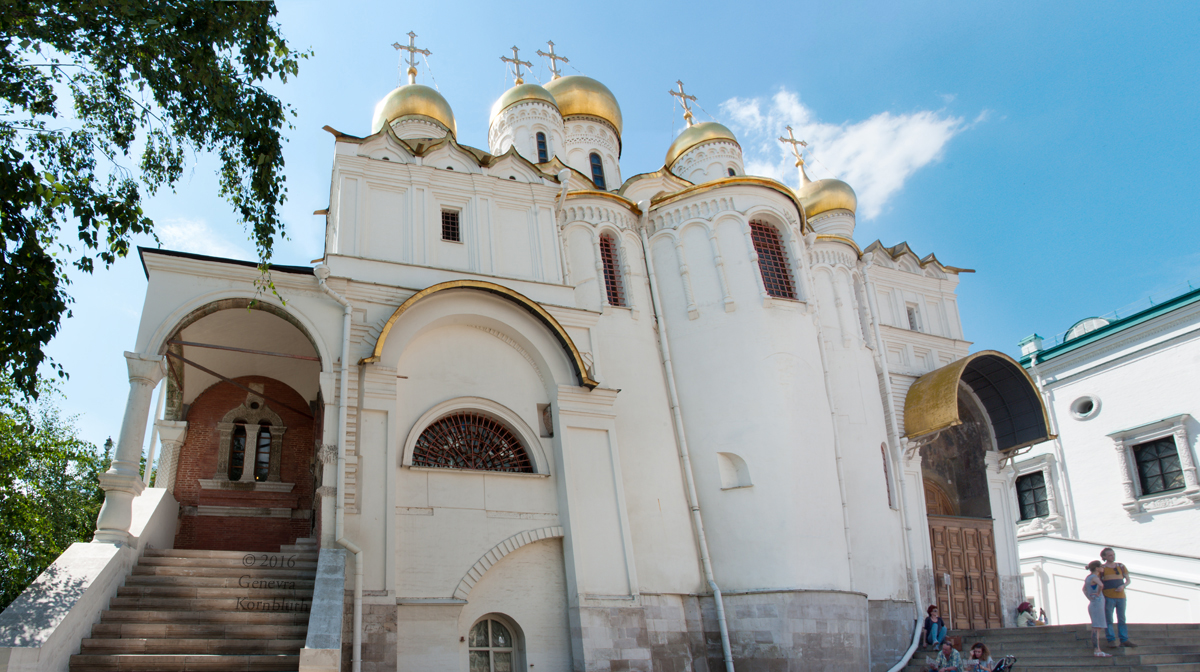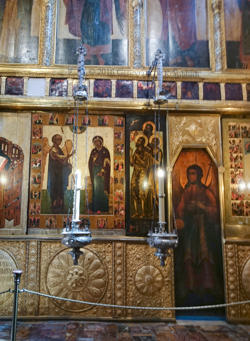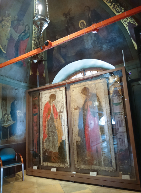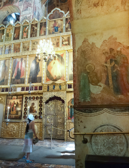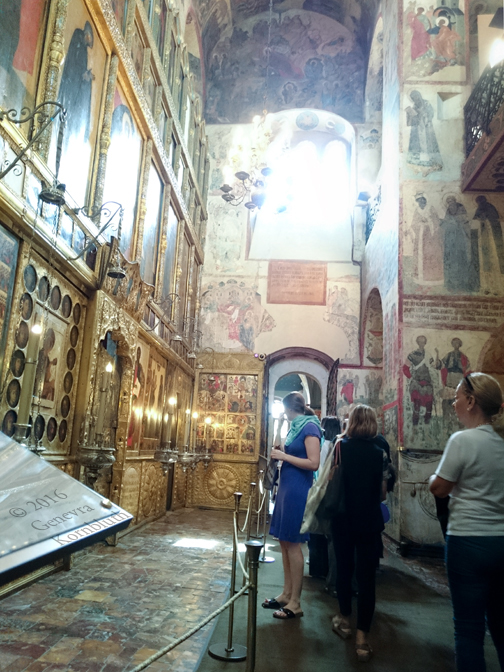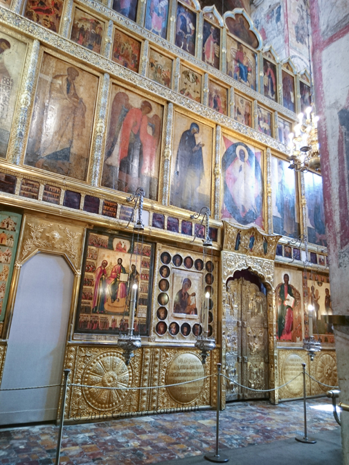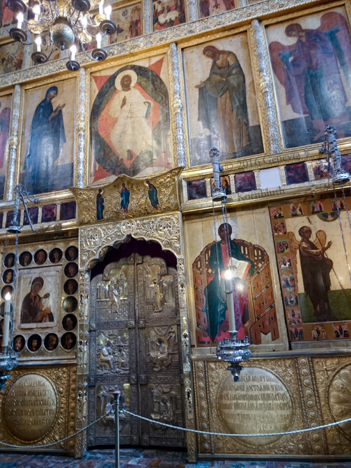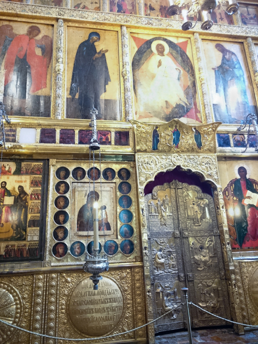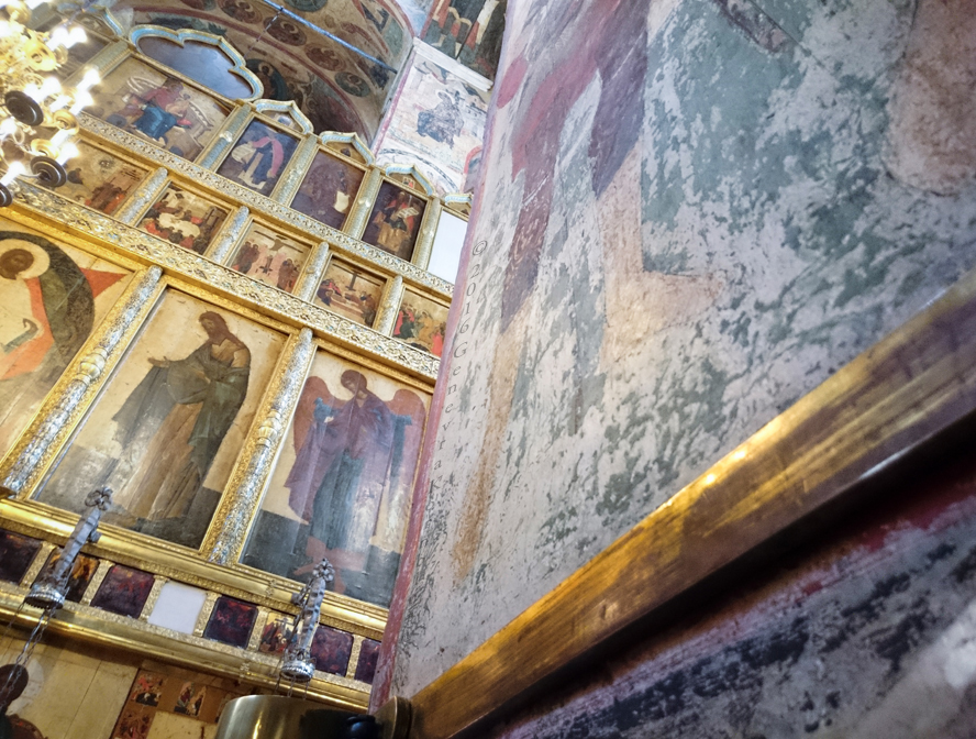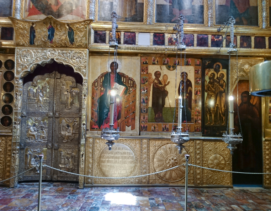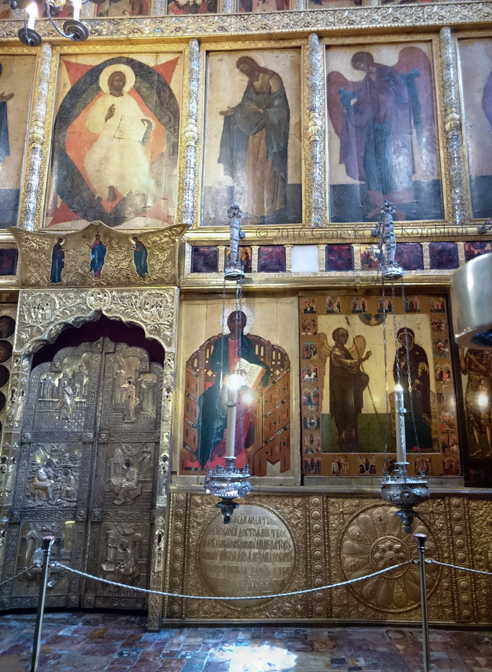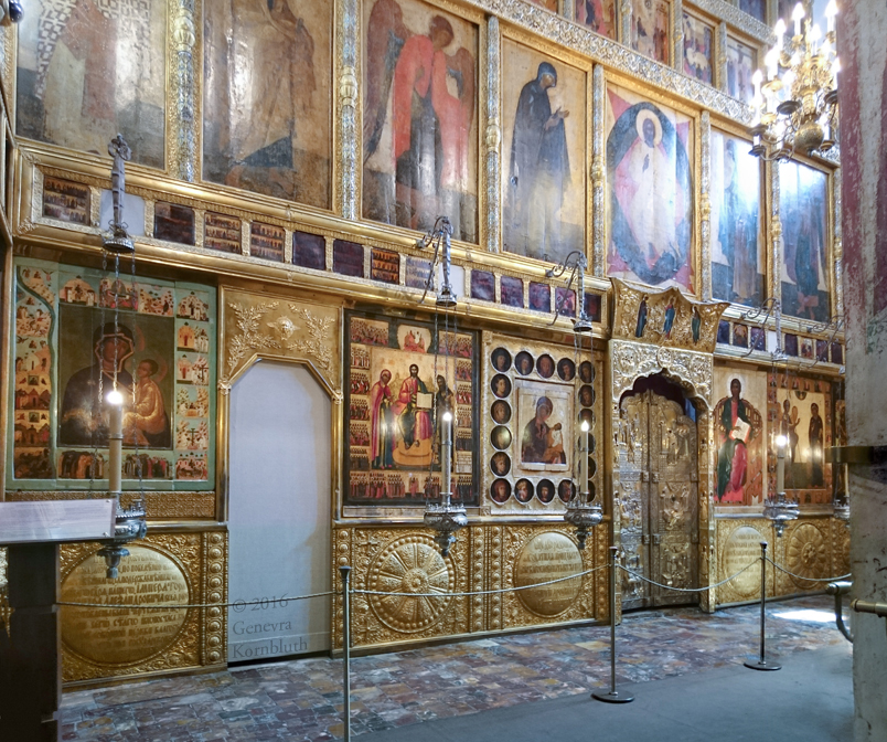 Historical Archive: Cathedral of the Annunciation, Blagoveschensky sobor Kremlin, Moscow foundations reused from 1416 church built 1484-1489 by master masons Kryvtsov and Myshkin of Pskov 1547 fire; restoration 1564-66 as palace cathedral for Ivan IV (the Terrible), with added domes and upper corner chapels Wall paintings 1547-1551 when not otherwise noted 1737 fire; restored 1815-20; closed from 1918, museum from 1955, renewed religious usage after 1992; restored 2006-10 Iconostasis 14th-19th century, restored 1920s Base roundels, center: prayers to Mary and Christ; sides: patronage Alexander III and Nicholas II Holy Doors, silver gilt, 1818 (Annunciation, Evangelists); columns, canopy, crown 1838 First painted tier (lowest, Veneration), left to right: Our Lady of Tikhvin, c.1565-1600; Deesis, late 17th c.; Virgin and Child, 15th c.; Christ enthroned, 1337, overpaint 16/17th c.; Annunciation, 1600-50; SS Peter, John the Baptist, and Alexis, 1682 Fyodor Zubov and others Second tier up (Menaion, calendar cycle): 17th c. Third tier (Deesis), left to right: Basil the Great, Peter; Michael, Mary, Christ Pantokrator, John the Baptist, and Gabriel prob. by Theophanes the Greek, late 14th c. Fourth tier (Feasts) early 15th c., Nativity and other panels poss. Andrei Rublev (Rublyov); Crucifixion poss. Prokhor Gorodets Fifth tier (Prophets), highest rectangular panels: mid 16th c. Sixth tier (Patriarchs, Forefathers): 1770s. framework gilded brass and enamel on copper, 1894 design N.V. Sultanov, completed 1896 by I.P. Khlebnikov jewelry firm