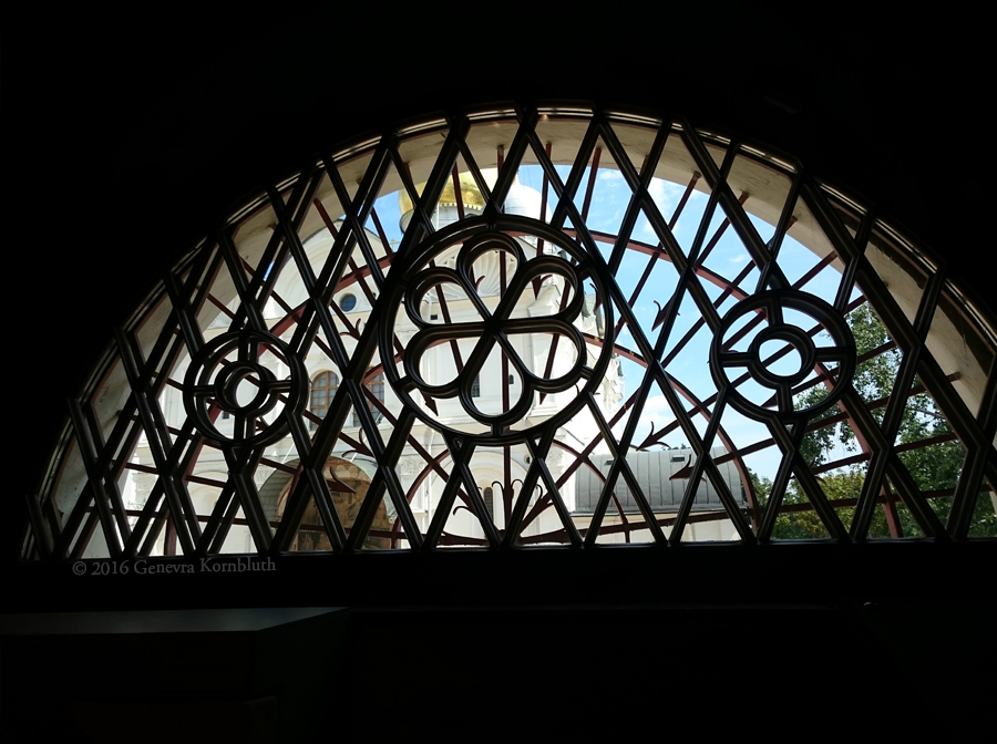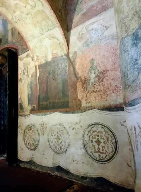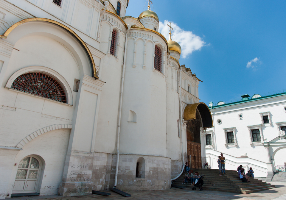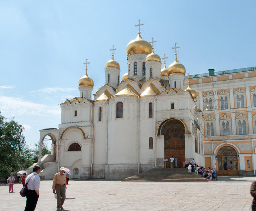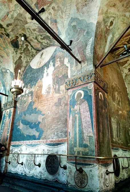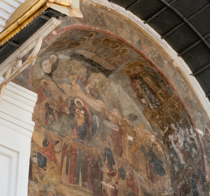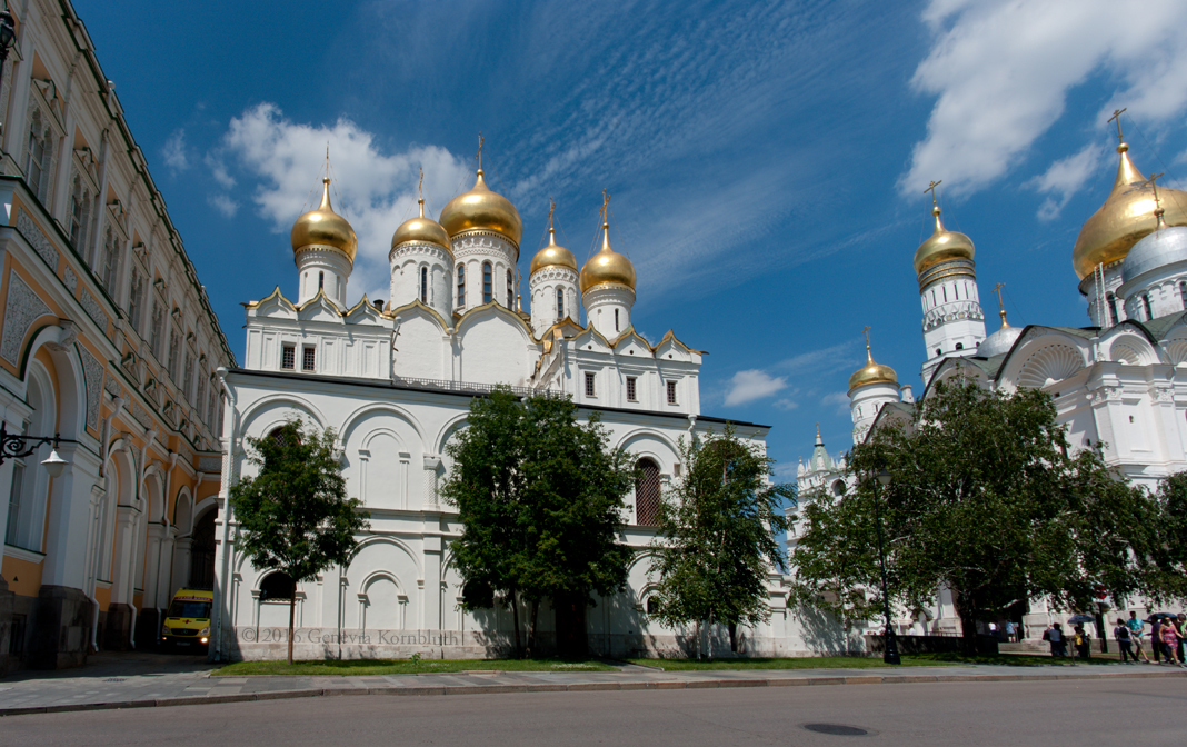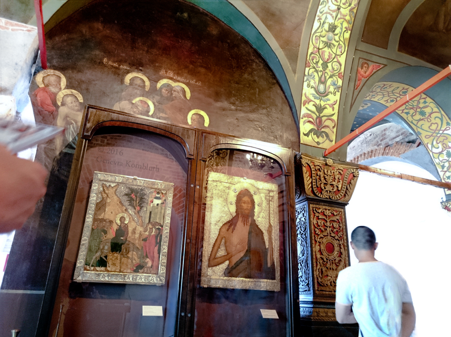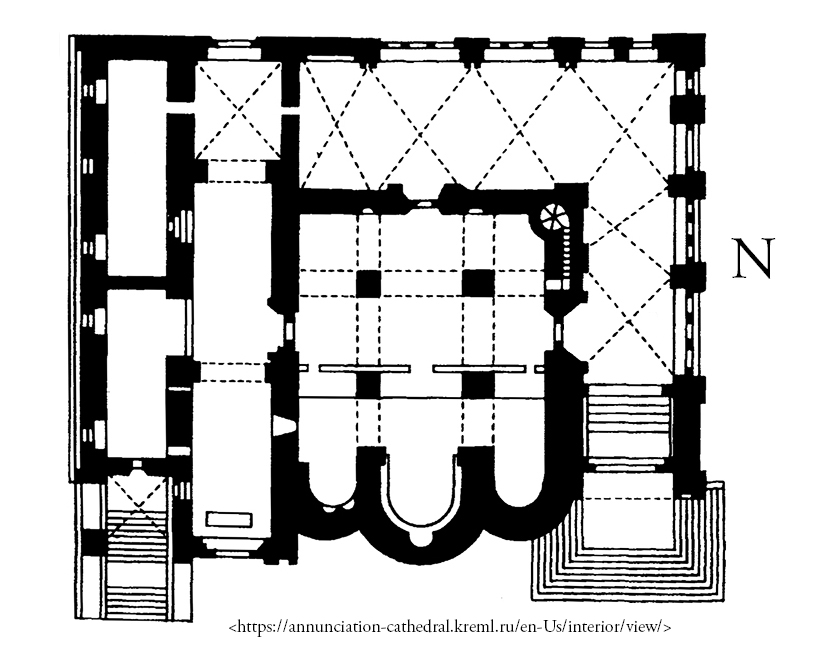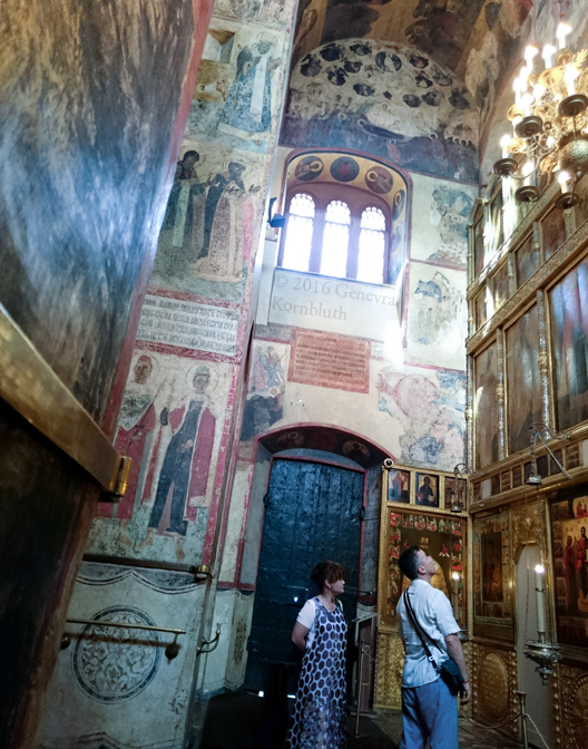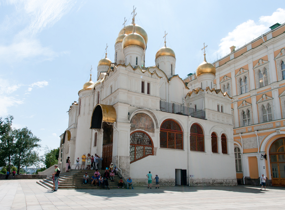 Historical Archive: Cathedral of the Annunciation, Blagoveschensky sobor Kremlin, Moscow foundations reused from 1416 church built 1484-1489 by master masons Kryvtsov and Myshkin of Pskov 1547 fire; restoration 1564-66 as palace cathedral for Ivan IV (the Terrible), with added domes and upper corner chapels Wall paintings 1547-1551 when not otherwise noted 1737 fire; restored 1815-20; closed from 1918, museum from 1955, renewed religious usage after 1992; restored 2006-10 Iconostasis 14th-19th century, restored 1920s Base roundels, center: prayers to Mary and Christ; sides: patronage Alexander III and Nicholas II Holy Doors, silver gilt, 1818 (Annunciation, Evangelists); columns, canopy, crown 1838 First painted tier (lowest, Veneration), left to right: Our Lady of Tikhvin, c.1565-1600; Deesis, late 17th c.; Virgin and Child, 15th c.; Christ enthroned, 1337, overpaint 16/17th c.; Annunciation, 1600-50; SS Peter, John the Baptist, and Alexis, 1682 Fyodor Zubov and others Second tier up (Menaion, calendar cycle): 17th c. Third tier (Deesis), left to right: Basil the Great, Peter; Michael, Mary, Christ Pantokrator, John the Baptist, and Gabriel prob. by Theophanes the Greek, late 14th c. Fourth tier (Feasts) early 15th c., Nativity and other panels poss. Andrei Rublev (Rublyov); Crucifixion poss. Prokhor Gorodets Fifth tier (Prophets), highest rectangular panels: mid 16th c. Sixth tier (Patriarchs, Forefathers): 1770s. framework gilded brass and enamel on copper, 1894 design N.V. Sultanov, completed 1896 by I.P. Khlebnikov jewelry firm