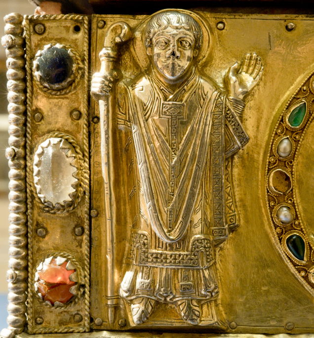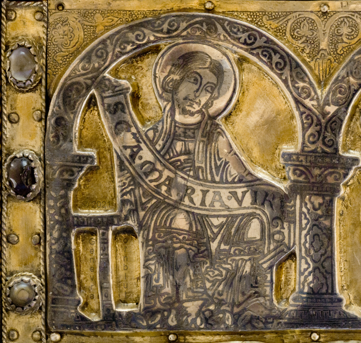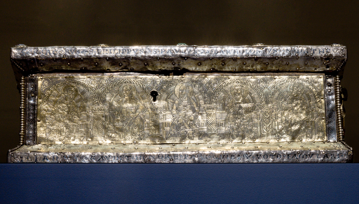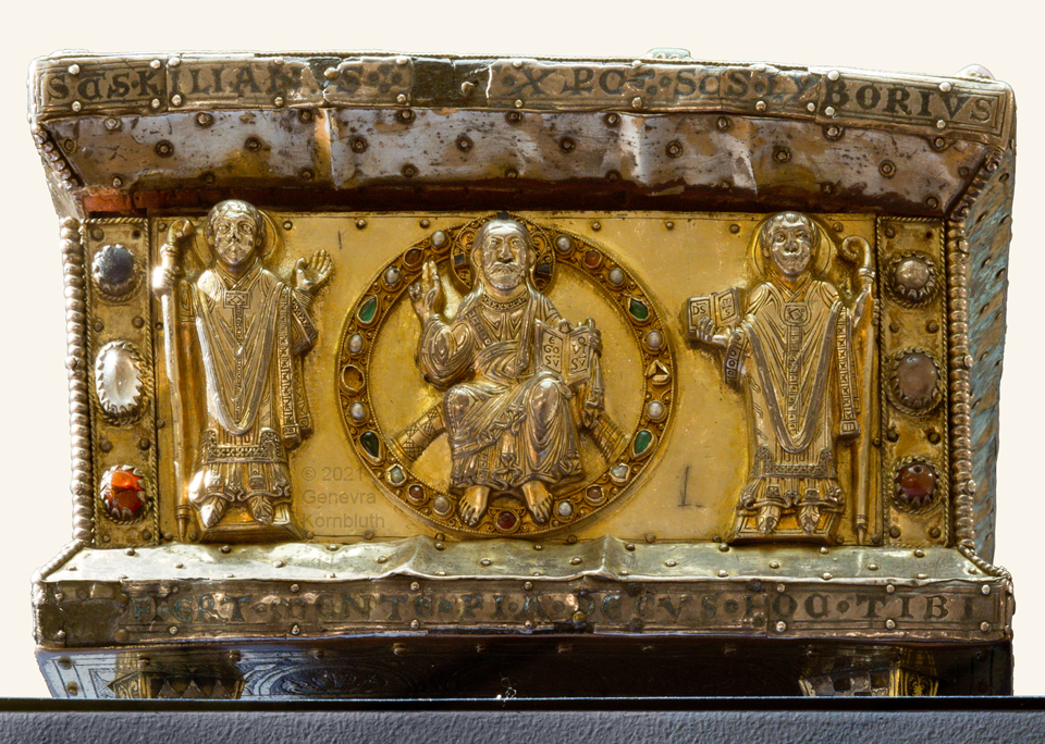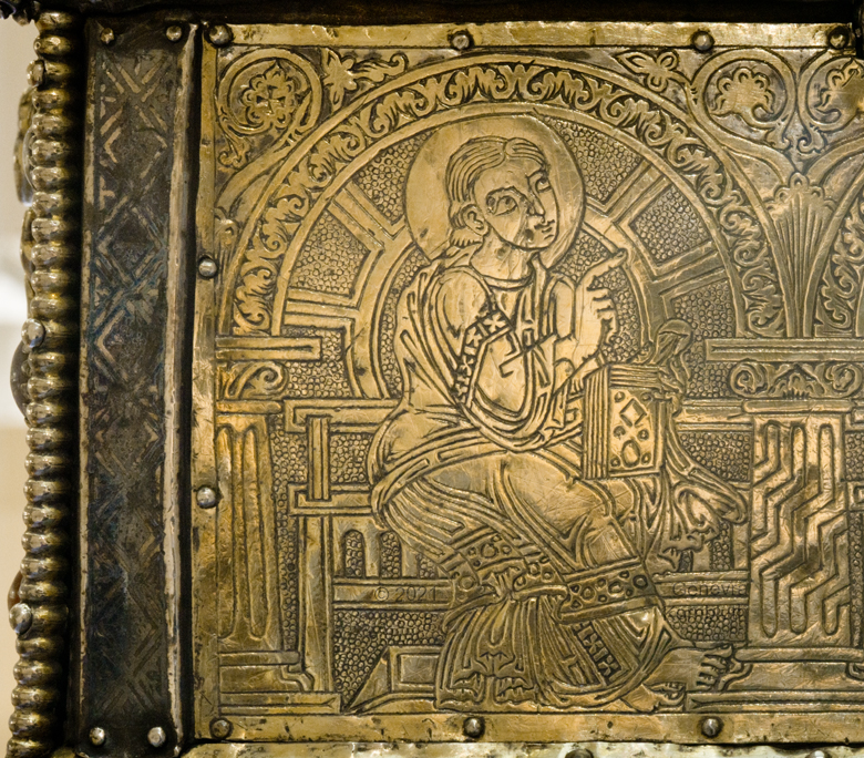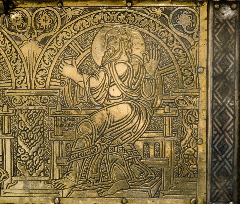 Historical Archive: Portable Altar from Paderborn Cathedral Roger of Helmarshausen, around 1105 or 1120-1127 made for Paderborn Bishop Henry II of Werl (reg. 1084 or 1090-1127) silver, gold, copper, bronze, gems oak core, altar stone green marble (Verde antico) 34.5 x 21.2 x 16 cm (13.6 x 8.3 x 6.3 inches) gems on top and corner strips later medieval lock and hinges 1650-61; walls of wooden core restored Paderborn Diocesan Museum DS2 |