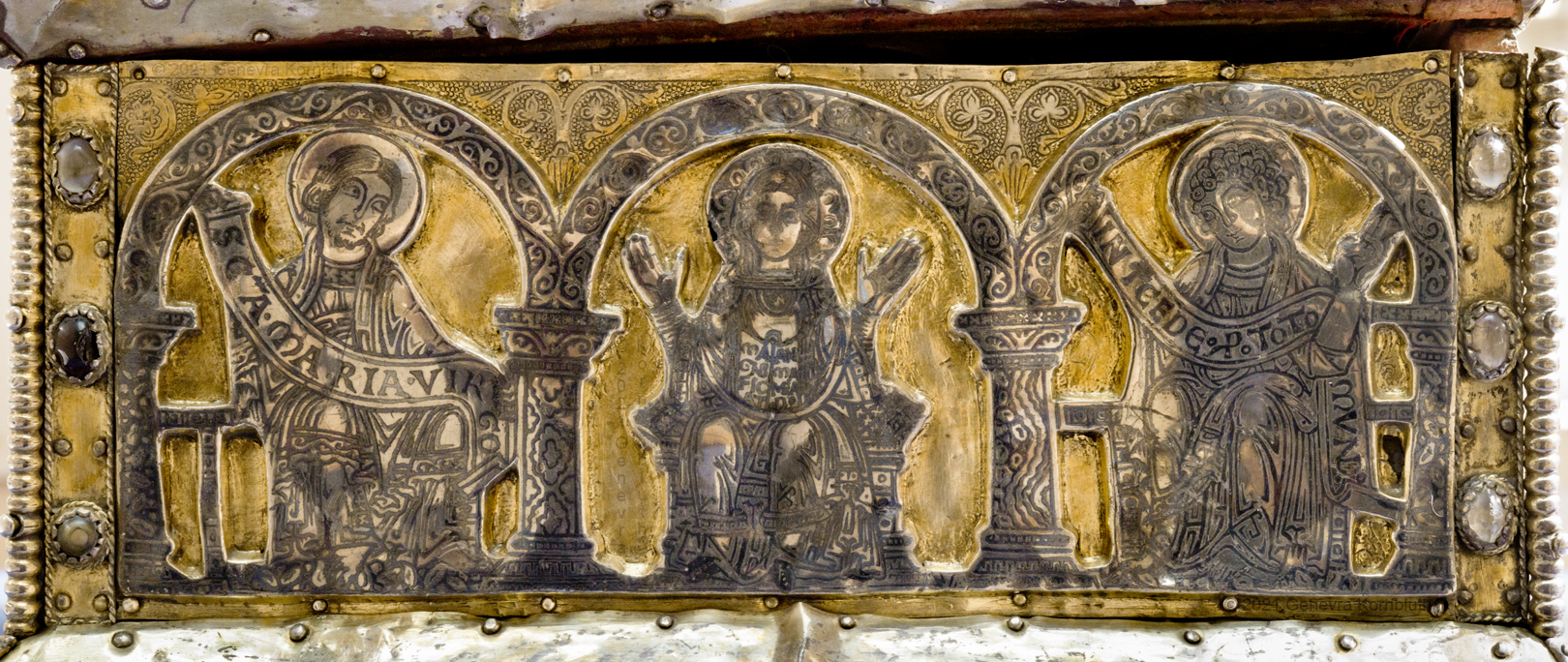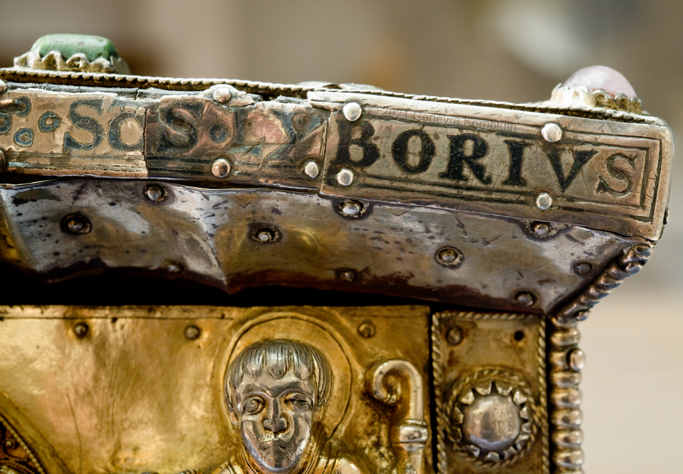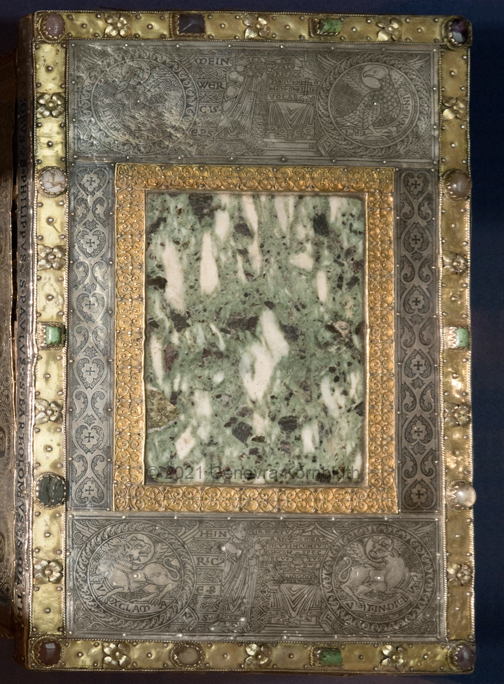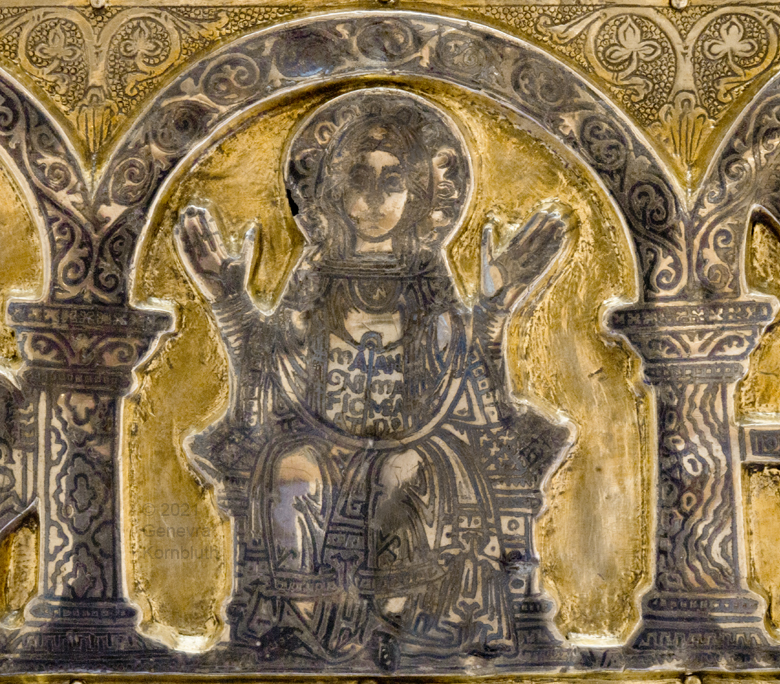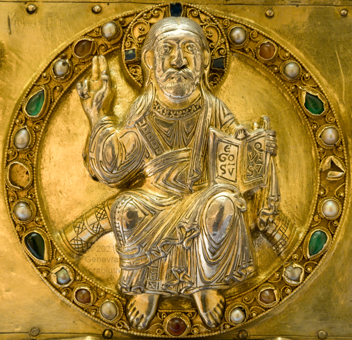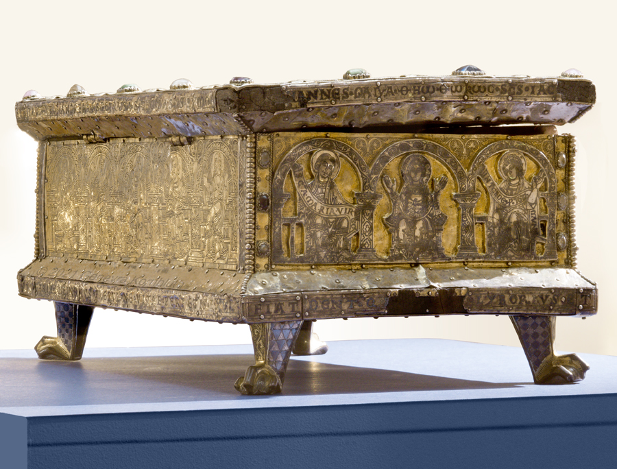 Historical Archive: Portable Altar from Paderborn Cathedral Roger of Helmarshausen, around 1105 or 1120-1127 made for Paderborn Bishop Henry II of Werl (reg. 1084 or 1090-1127) silver, gold, copper, bronze, gems oak core, altar stone green marble (Verde antico) 34.5 x 21.2 x 16 cm (13.6 x 8.3 x 6.3 inches) gems on top and corner strips later medieval lock and hinges 1650-61; walls of wooden core restored Paderborn Diocesan Museum DS2 |