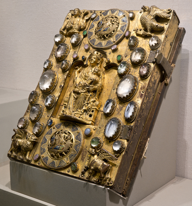 Historical Archive: Höxter Lexionary Cover oak, bronze and copper both gilt, enamel, rock crystal and other gems 32 x 23.5 cm (12.6 x 9.25 inches) around 1200-1225; medallions Limoges, other metalwork Lower Saxony parts probably assembled into a new cover after 1278 fire; brass clasps later from St. Aegidien, Braunschweig; after secularization Höxter, Katholische Pfarrgemeinde St. Nikolai Paderborn Diocesan Museum PR52