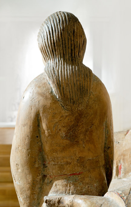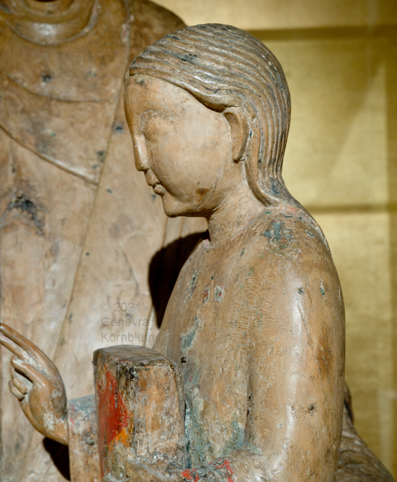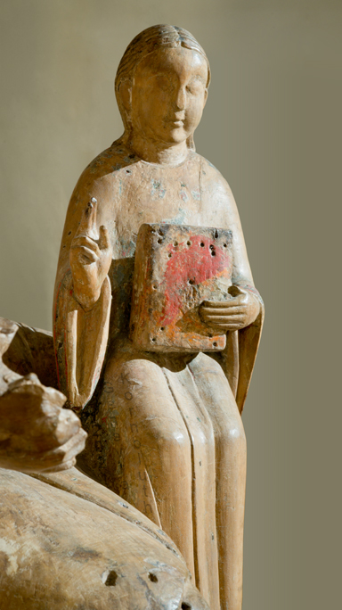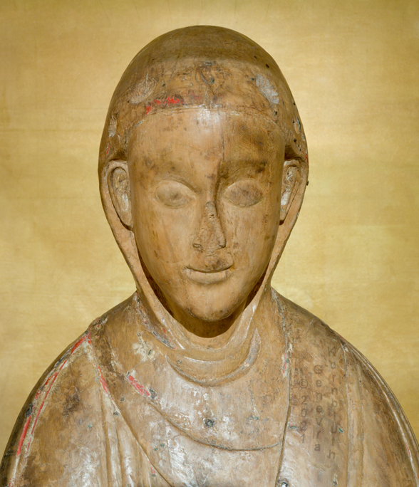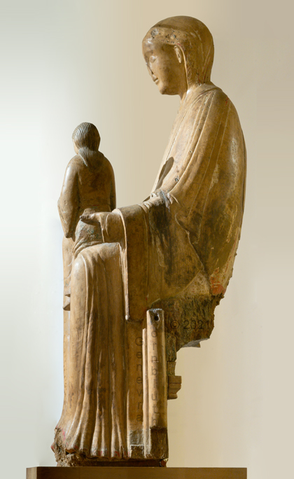 Historical Archive: Imad Madonna linden wood, originally polychromed, height 112 cm (44 inches) covered with copper gilt after 1058 fire, casing removed 1762 back hollowed for relics northwestern Germany, 1051-1058 made for Bishop Imad of Paderbnorn (reg. 1051-1076) restored 19th c., 1960-70 Paderborn Diocesan Museum SK1