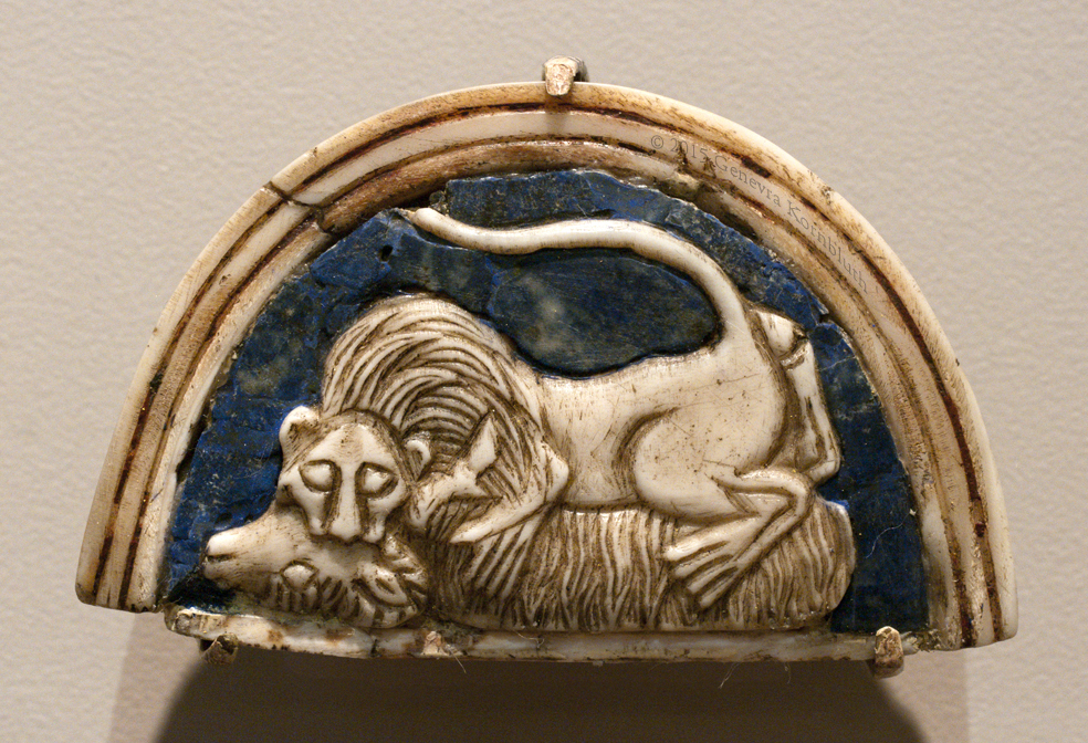 cosmetic box lid: lion attacking sheep or goat, shell and lapis lazuli, Ur c.2550-2450 BCE, Penn B16744A