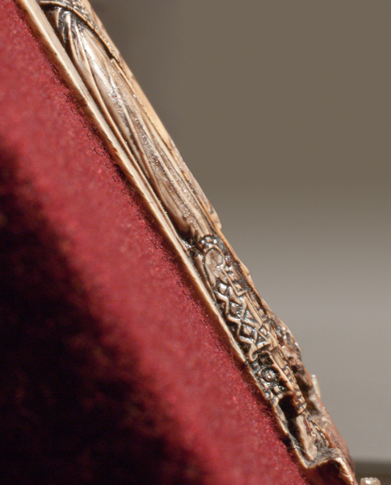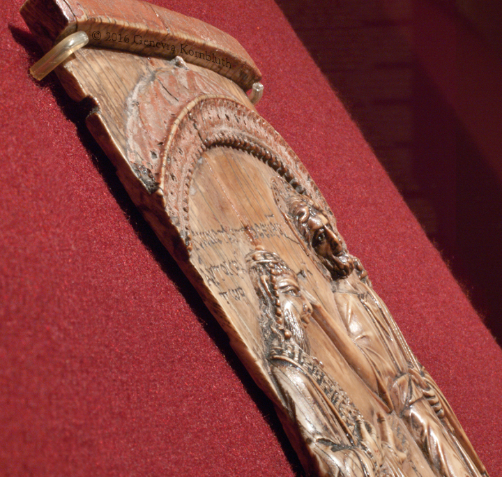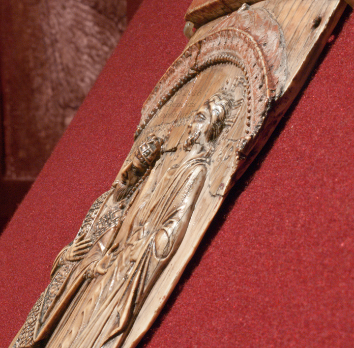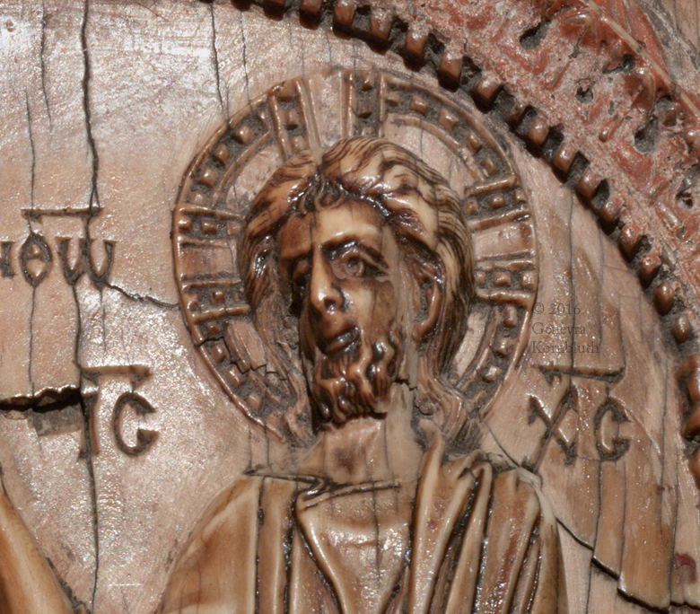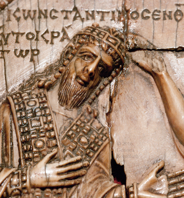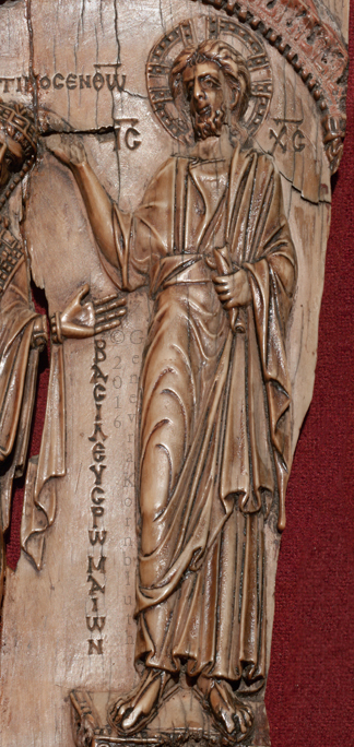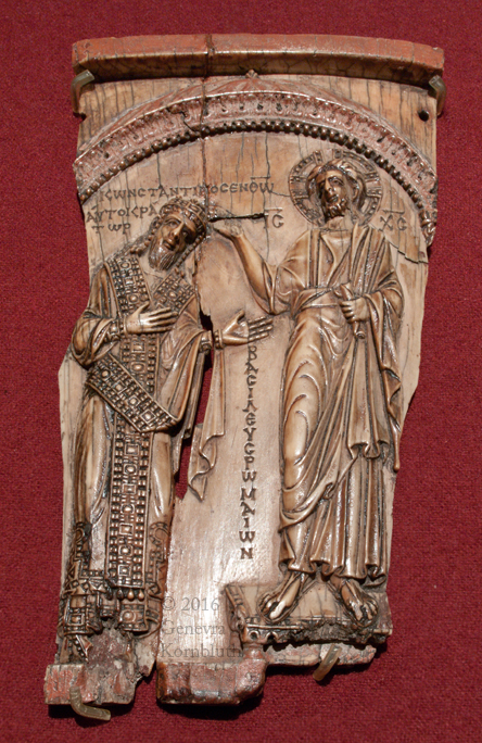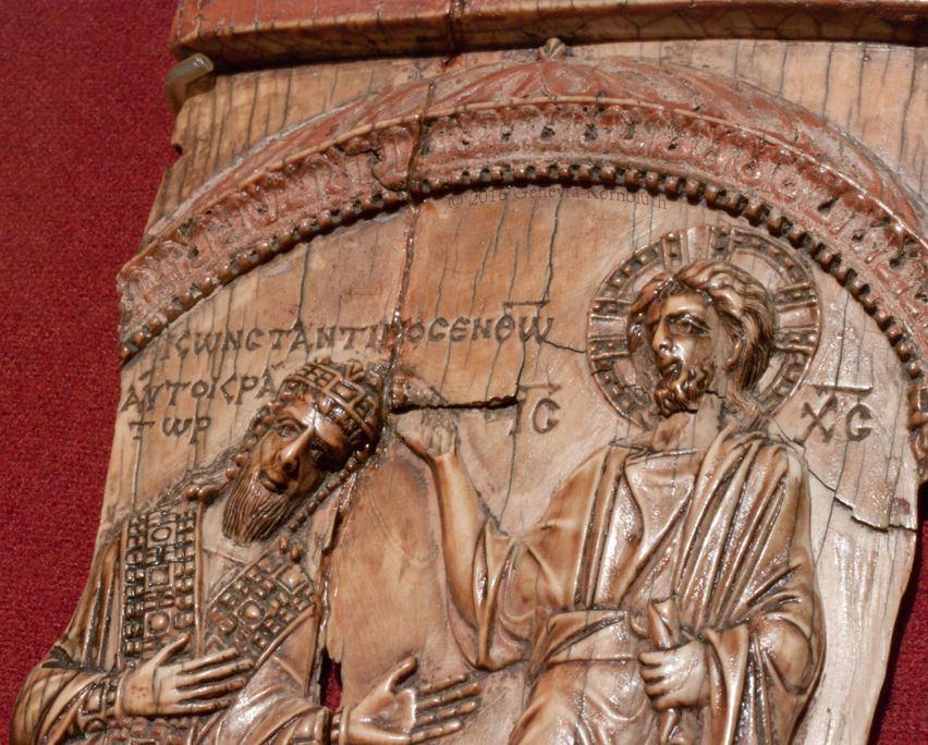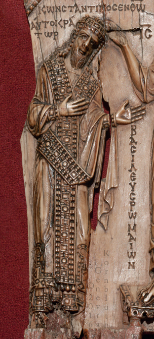 Emperor crowned by Christ ivory, 18.6 x 9.5 cm (7 1/8 x 3 1/4 inches) surface coated with a reflective substance emperor: Constantine VII Porphyrogennitos, reg. 945-959 mid tenth century, probably c.945 Greek inscription: Constantine in Christ Emperor and Basileus of the Romans Moscow, State Pushkin Museum II 2 b 329 |