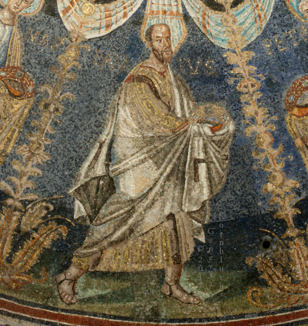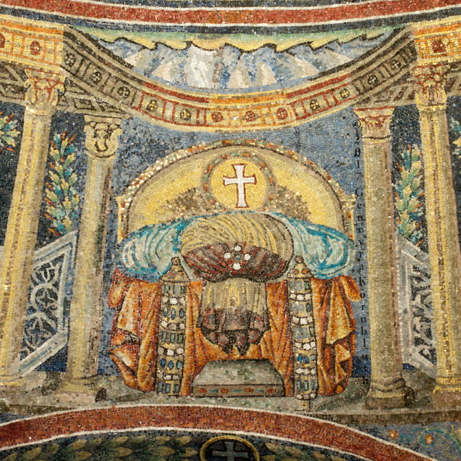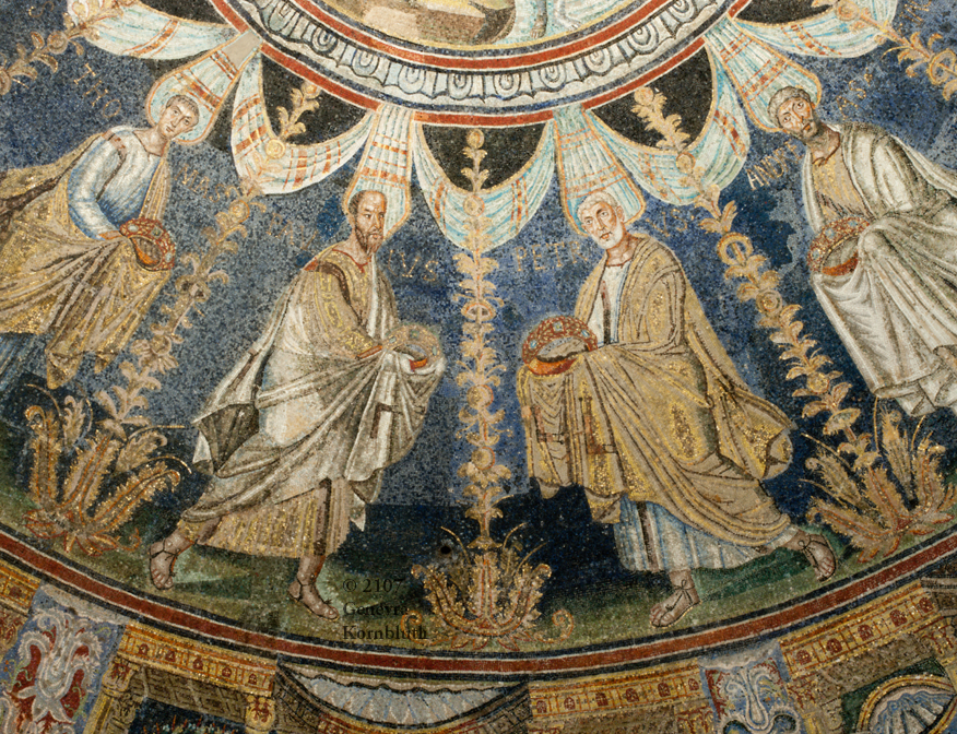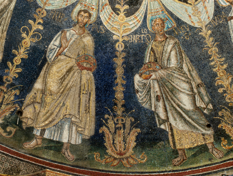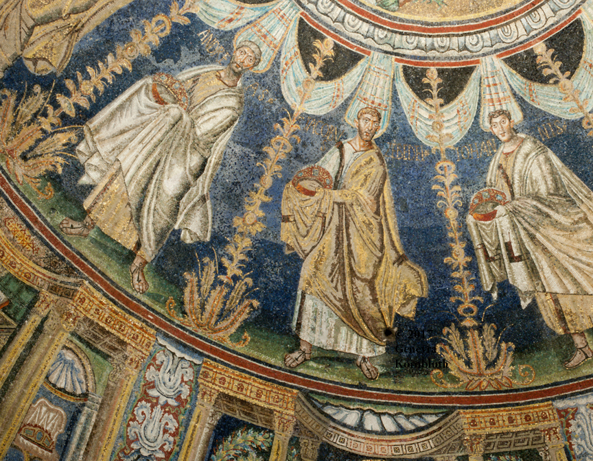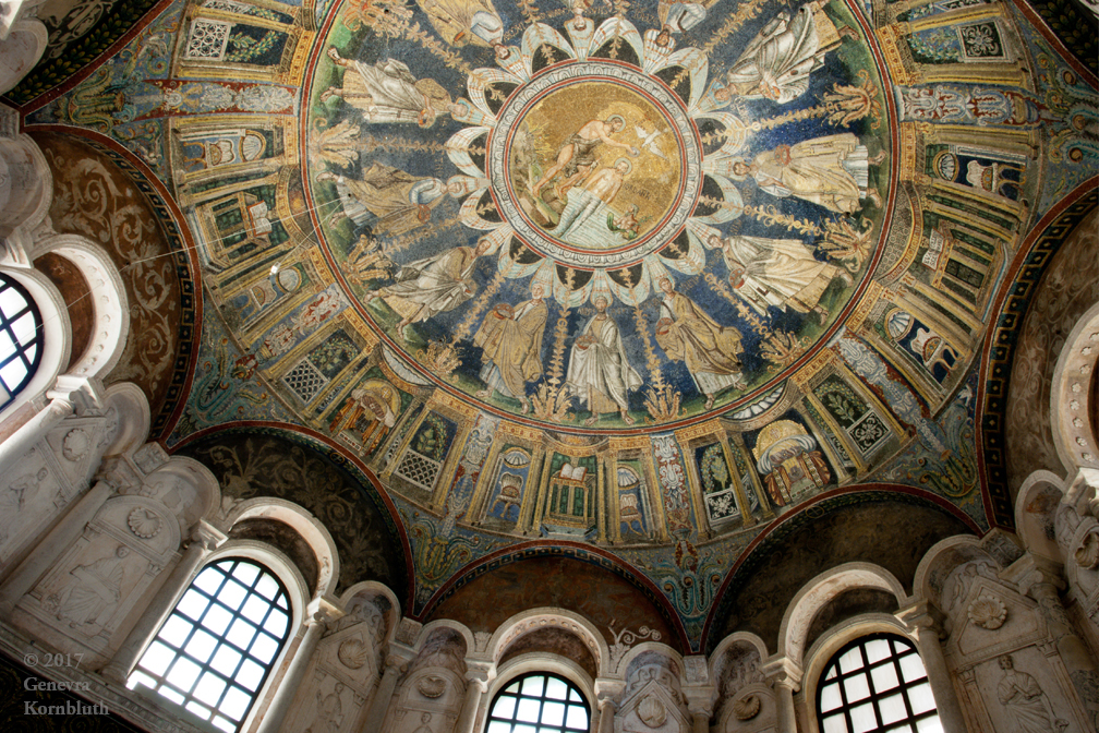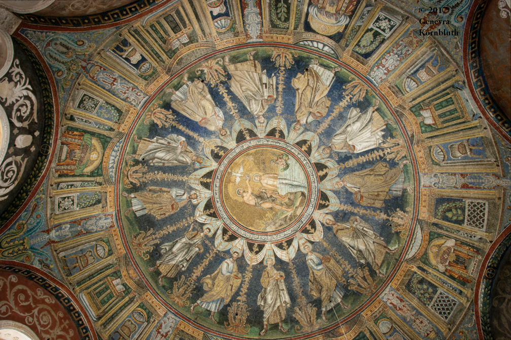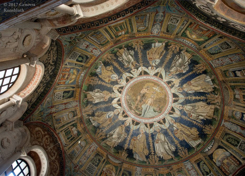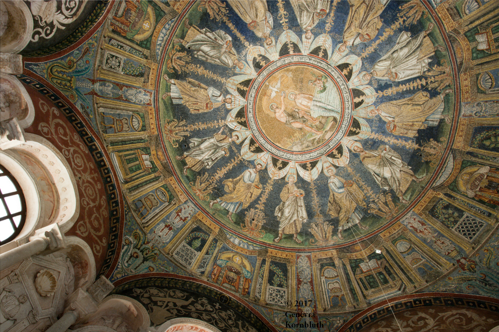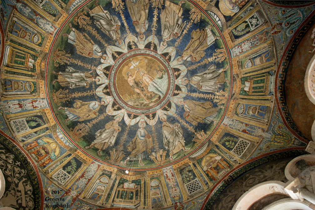 Baptism heavily restored, 18th c. and in 1860s Felice Kibel: heads, dove, upper cross, gold ground around them