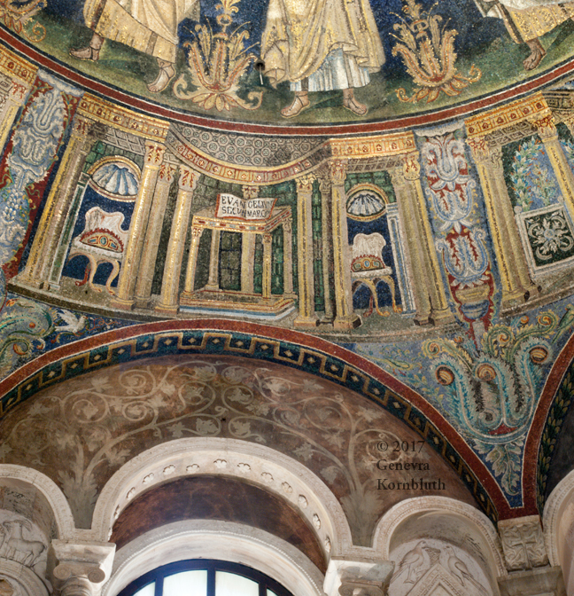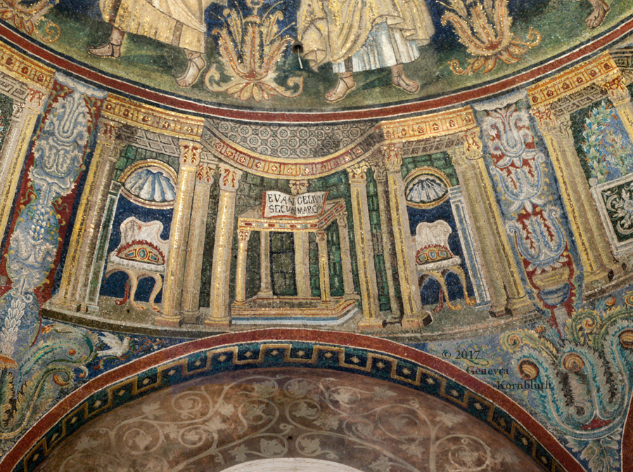Gospel of Mark on altar with architectural frame. Altar restored.