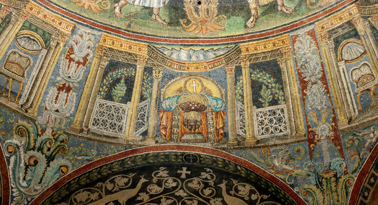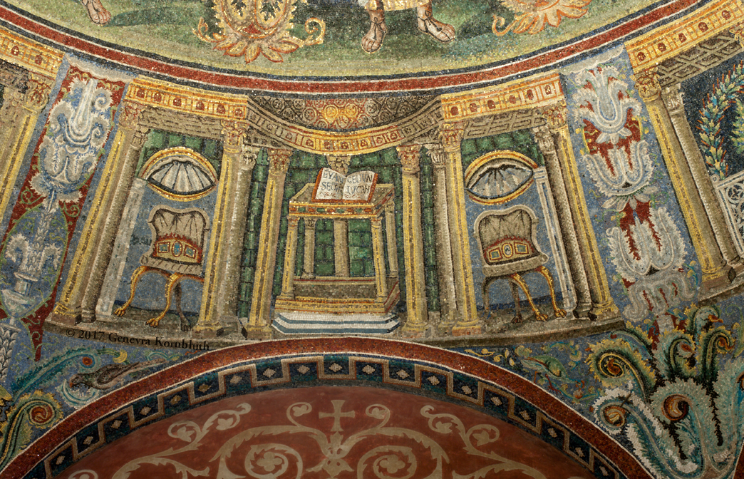 prepared throne (Etimasia) below Bartholemew, with ?floral candelabrum and painted tympanum