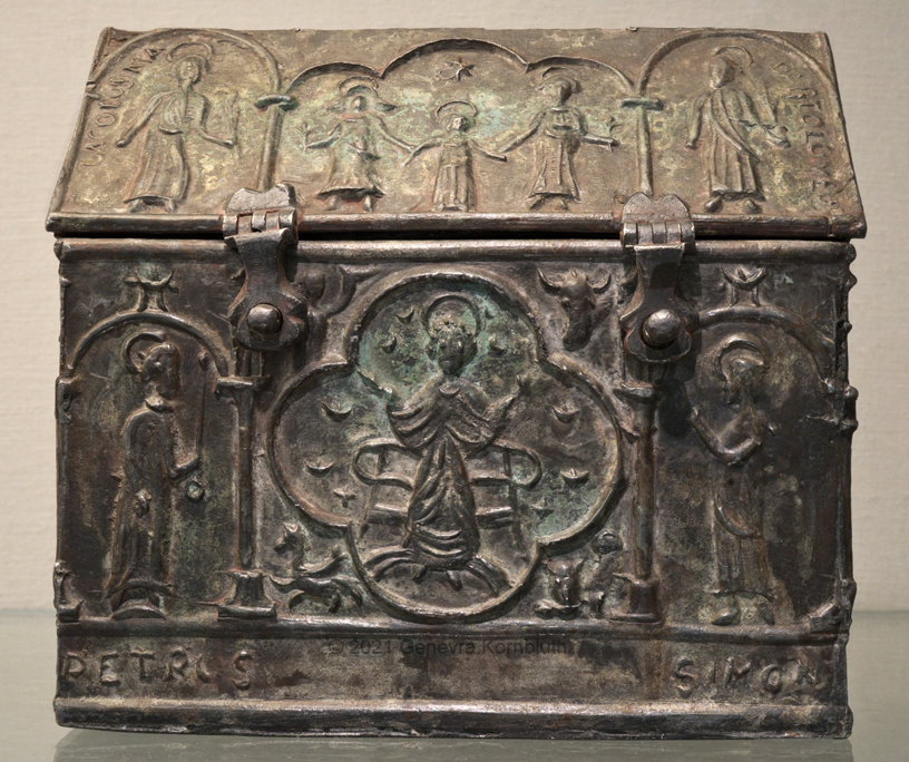 cast lead reliquary w. SS. James the Greater, Bartholemew, Peter, Simon; poss. Westphalia, 18th c., DMP G1.7. For other views see DMP.