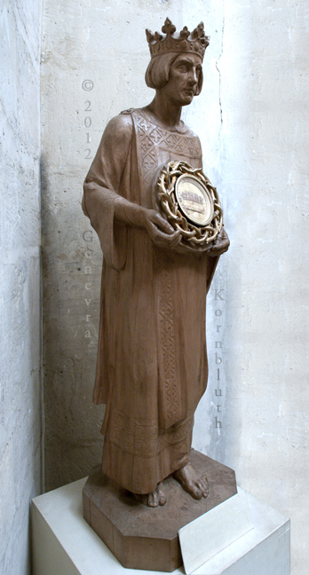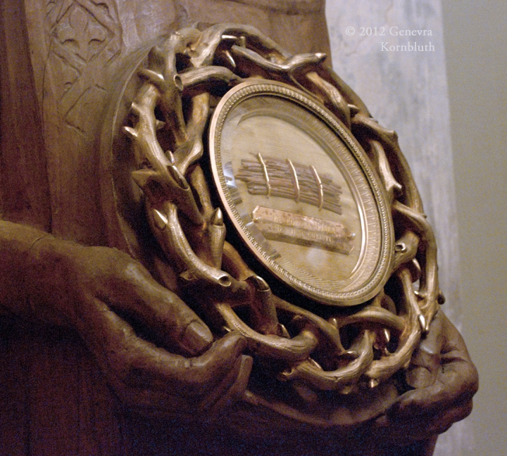 St. Louis holding the Crown of Thorns, linden wood, A. Carvin 1927; with silver gilt and glass reliquary, 1833 holding relics from Ste. Chapelle, Paris; Sens CT
