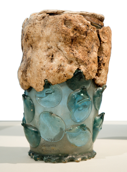 reliquary: blown glass beaker, wood, wax, Germany c. 1450, V&A C.280-1936