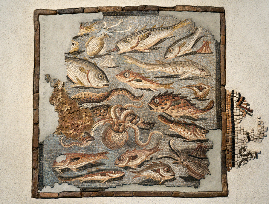 sea life, stone mosaic w. terracotta frame/box, 1st c., fr. a domus north of Aquileia, ANAM. For details see ANAM.