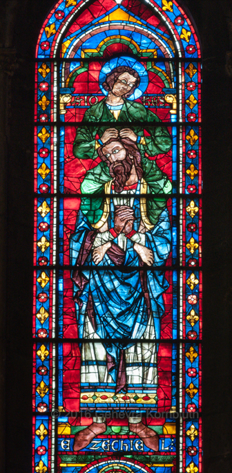 Ezechiel supporting John: Chartres cathedral, south transept windows 1221-30. For more views, and eagle in same windows, see Chartres.