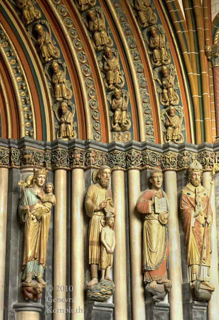 Maastricht, St. Servatius, 13th c. portal with 19th c. polychrome: Mary (1885 replacement for Simeon), Baptism, John the Evangelist, Servatius. For contiguous images see Servatius.