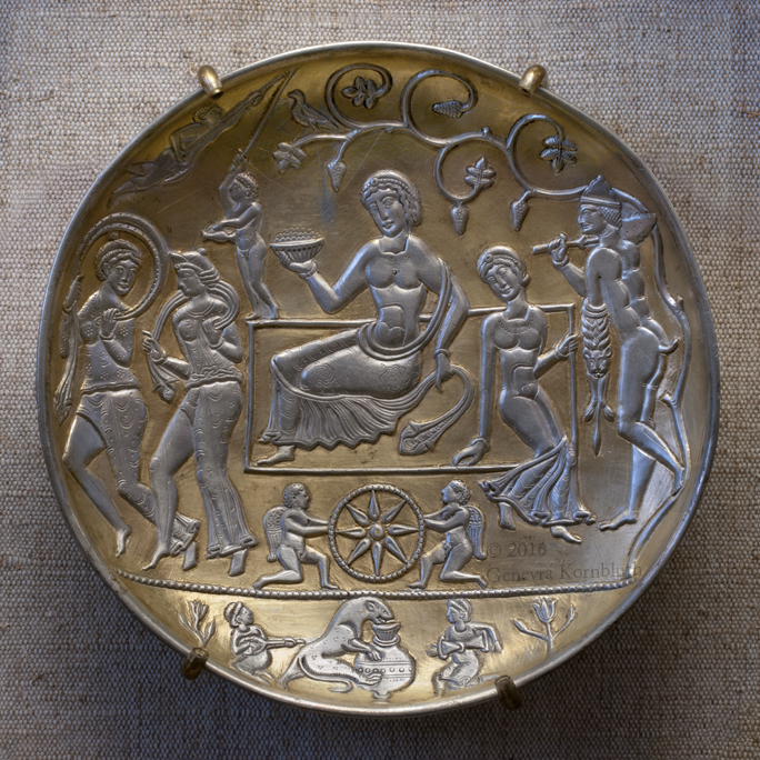Dionysiac scene on Sasanian silver/gilt dish, 224-651, from Alkino village, Pernoll, MSHM