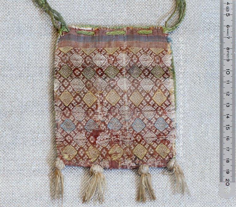 Woven silk purse with strap, Spain 13th-14th c., length 12.2 cm, Sion CT purse 258