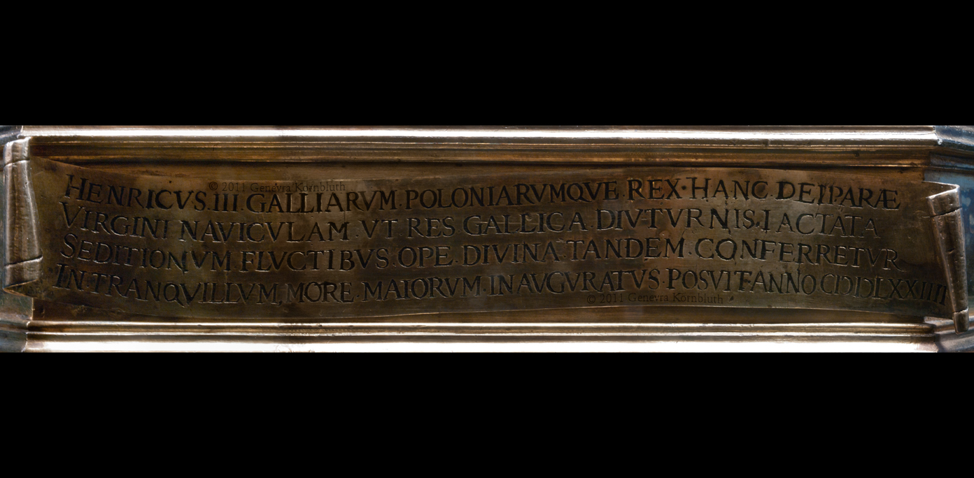 1574 inscription, Nef of St. Ursula, gold/silver gilt/copper/enamel, which has its own page