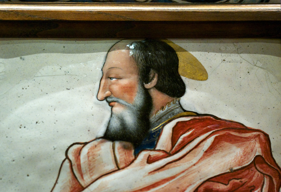 Léonard Limosin (attrib.), enamel on copper from Feuillantines convent (Paris), repeating Chartres composition: François I as St Thomas the Apostle, mid 16th c. Limoges, Louvre MR XIII suppl 211