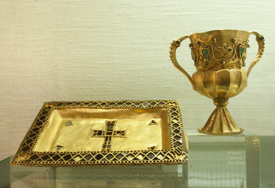 Gourdon Chalice and Paten. Gold, turquoise, red glass, and garnet, c.500, CdM. These works have their own page.