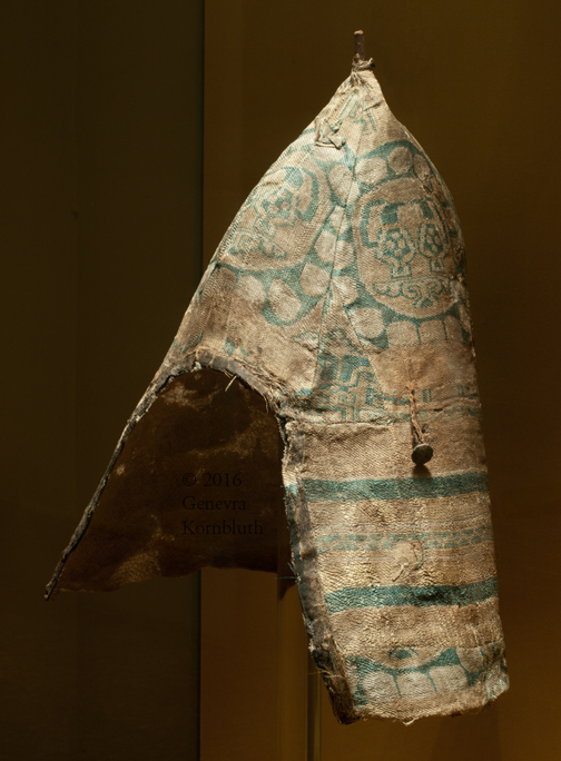 man's headdress in helmet form, 8th c. silk/linen/wood/leather, Hermitage КЗ-4576, fr. Moshchevaya Balka, which has its own page with details