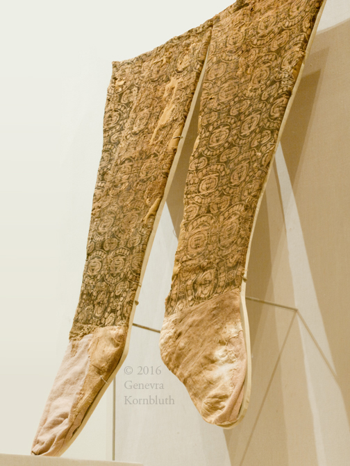 leggings, silk with linen feet, 7th-9th c., Met 1996.78.2a, b, prob. fr. Moshchevaya Balka, which has its own page with details