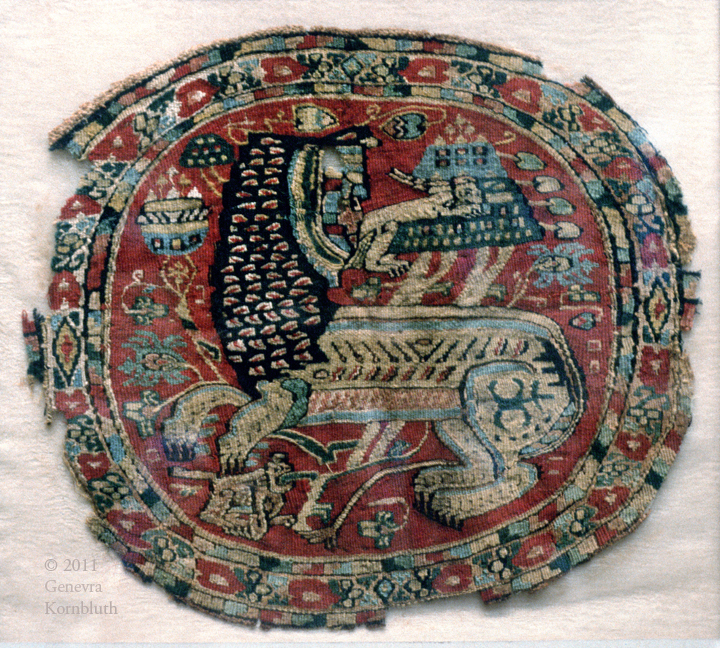 lion, medallion tunic inset, linen and wool, 7th c. Akhmim, Pushkin 5177