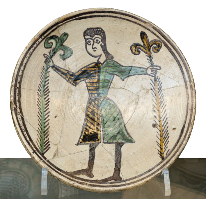 man between lillies, tin-glazed earthenware, south Italy, 2nd half 13th c., V&A C.120-1978