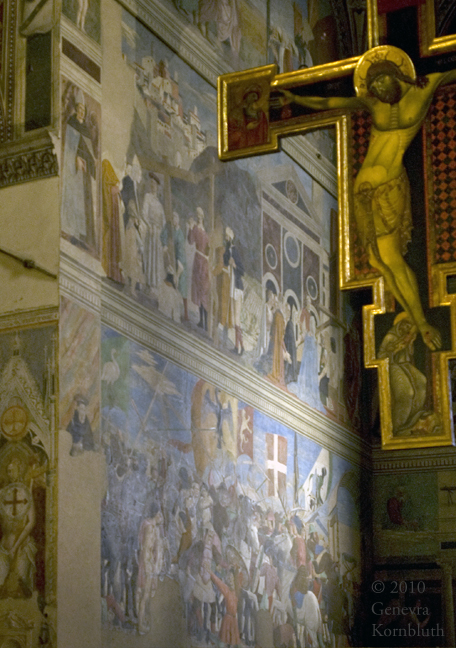 13th c. Crucifix with St. Francis, and Piero della Francesca frescoes: Legend of the True Cross, 1452-66, San Francesco, Arezzo. For another view see Arezzo Churches.